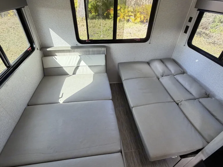 Bright RV rental interior features light grey convertible seating and beds, offering scenic views through large windows.. East to West Silver Lake 2023