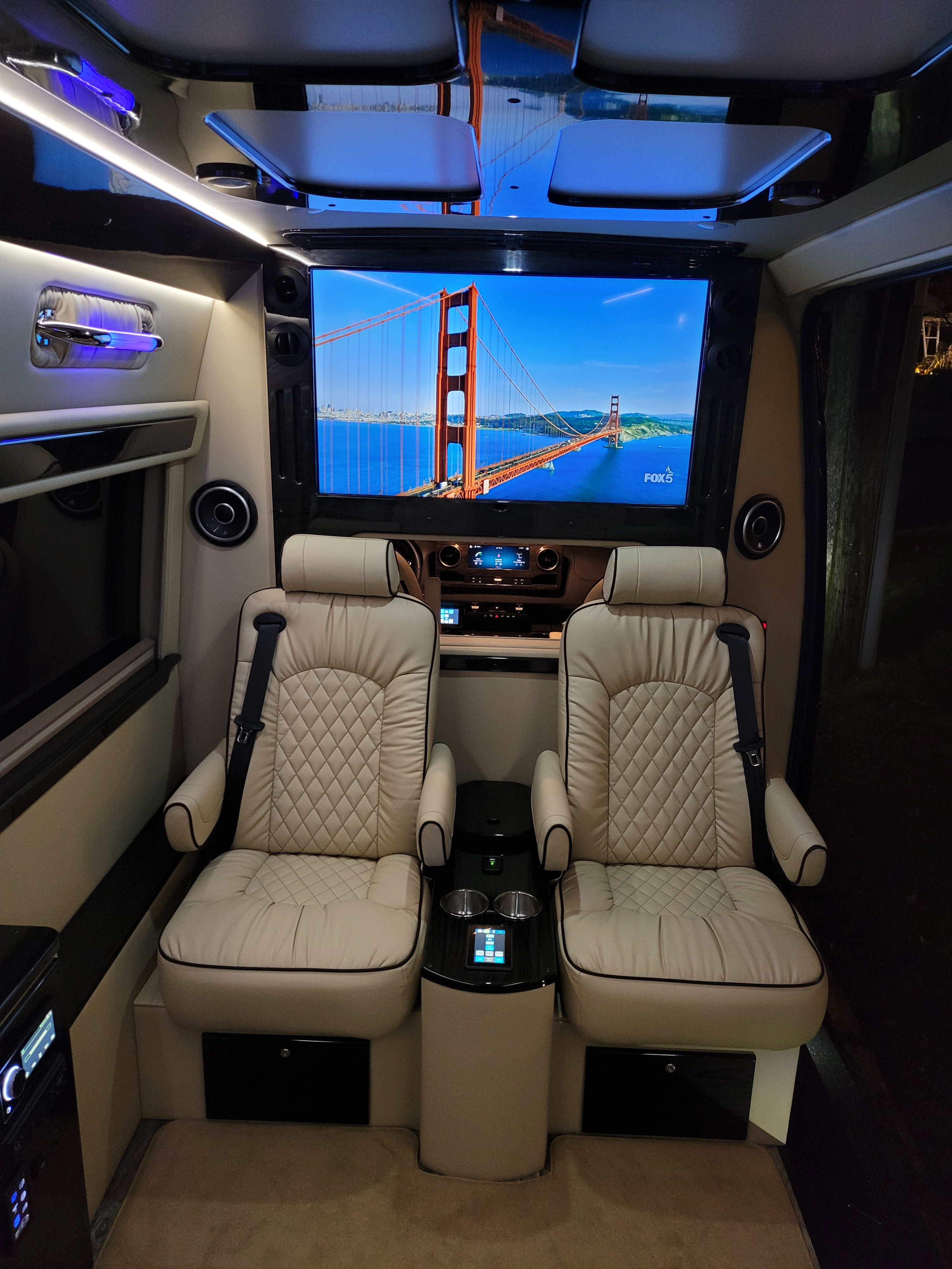 What's includedChairs, linens, pillows available on request.RecommendationsThis is an excellent vehicle with a ton of versatility. Good for overnights with the couch easily convertible to a comfortable bed. Excellent for Business travel, with fast wifi, TV, tray tables, and plenty of outlets. Also comes with a privacy partition for confidentiality. Great for Tailgaiting with a bathroom, refrigerator, microwave and eternal speakers as well as TV hookups. Driver available upon request.