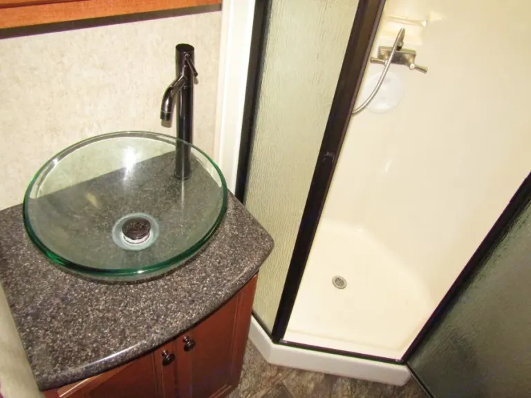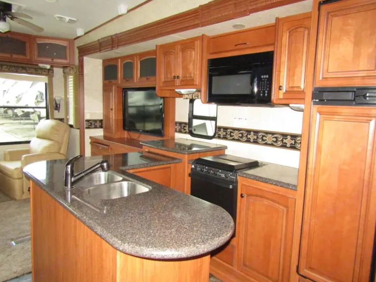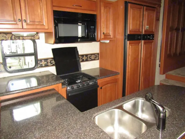 From a larger than typical kitchen with granite countertops, wooden cabinets,5 inch crown molding , extra storage. Walk up and in split level master bedroom, walk around king size bed with TV and large master closet extra drawer cabinet space. The main cabin has 2 lazy boy recliners, leather love seat that turns into double bed, then more storage, 2 ac units , 10 gallon water tank ( hot water- lots of shower time) even outdoor shower. Large clothe closet, extra hanging closet space in main living area. Large pantry, 2 door refrigerator, two door freezer with ice maker. flooring is a combination of linoleum floor tiles ( easy cleaning) and carpeting.