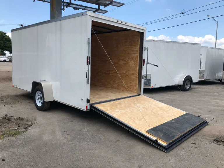 Brand new 7' x 14' single axle trailer with high roof. Has side man door and full fold-down rear door. Has brakes and lights. 3000 lb max load.