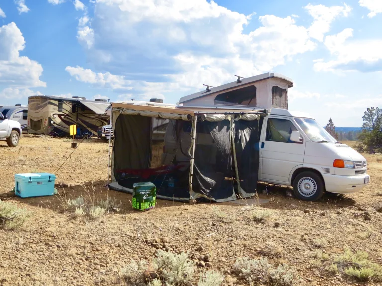 10x10 room that attaches to awning. Room has a floor a d screens that can be covered with flaps