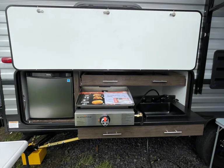 This camper has an outdoor kitchen that is very handy as well. The fridge only works while plugged into AC though. There is a Blackstone as well for the meantime. We are debating on changing that to a propane grill though?