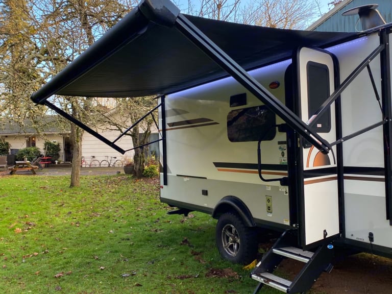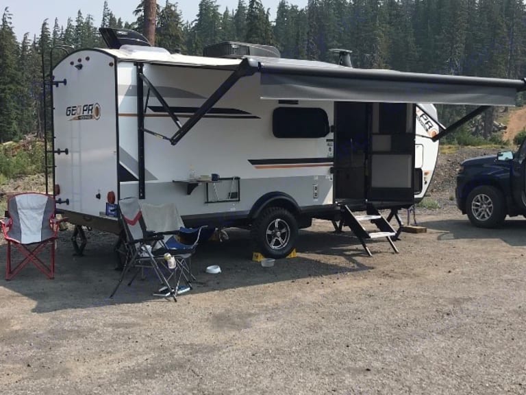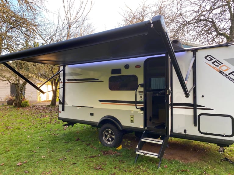 2021 Rockwood GeoPro ready for your adventures! This Geo is compact and lightweight but spacious and comfortable for a family of 5 and a dog or two! Amenities include: Recessed Cook top (no oven), 12V Refrigerator, convection microwave, flush toilet, indoor and outdoor shower, 12 Volt TV w/ DVD Player, Radio, Bluetooth and potential for Wifi capability, Gas/Electric Water Heater and wall-mounted outdoor gas grill, A/C, 20,000 BTU Furnace and roller shades for cross ventilating windows. Geo also has a 190 Watt Roof Mount Solar Panel w/ 1000 Watt Inverter for extended Boon Docking capability! 2 5/8 Anti-sway bar hitch available to use no extra charge!What's includedIncluded basic pots/pans/strainer, plates/bowls/cups, silverware, cooking utensils, some basic spices, can/bottle openers, dish towels and dish soap, bath towels (if needed), small french press, fitted bed sheets and light weight blankets, starter toilet paper, small garbage can, garbage bags, outdoor table and two camping chairs.RecommendationsGeneral Items not included and to consider bringing: heavier blankets or sleeping bags, extra camping chairs, food/drink, cooking essentials (i.e. oil, spices, etc...) beach towels, paper towels, additional RV rated toilet paper for extended trips, matches, storage containers for leftovers, tin foil/plastic wrap/baggies and toiletries for extended trips. Other things to note1-2 Pets Welcome with approval