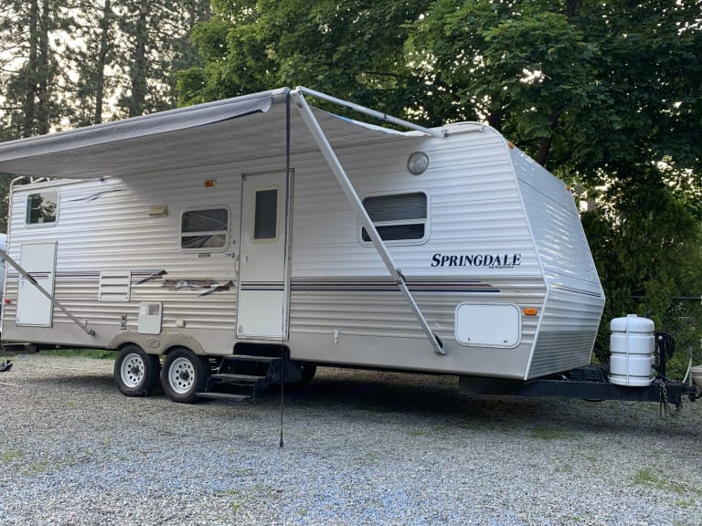 Great family friendly trailer with a queen bed and two bunks plus additional sleeping options in a fold down couch and dinette. The slide opens up the living area so it feels nice and roomy. This trailer comes stocked with all linens for beds, towels, cooking supplies, dinnerware, and even camp chairs. This trailer will take the work out of camping so you can fully enjoy your vacation.