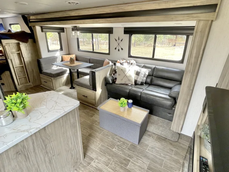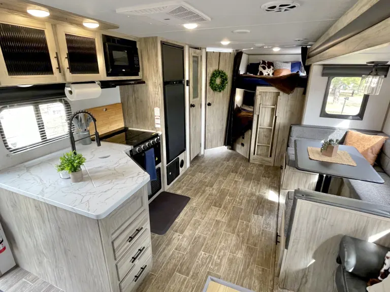 Multi-sleeper and family fun trailer! Interior highlights include an oversized u-dinette, oversized double bunk beds, stylish flip sofa for additional seating/sleeping, master bedroom with dual access and a farm style sink. Some exterior refinements include an oversized 20’ exterior awning, dual entry, and a deluxe outside kitchen for the camp chef!What's included• Includes fitted sheets on all 3 beds (full bedding and blankets available as an add-on)
