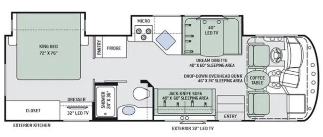 Get ready for your next adventure in this fully stocked RV featuring 2 slide outs and all the amenities needed for any road trip you take. There is even an outdoor kitchen and TV for you to enjoy.You'll notice the spacious interior with a large driver's side slide out. There is a jack-knife sofa to the left of the main door perfect for extra sleeping space. Opposite find a booth dinette with 40" LED TV overhead. The dinette features two sets of seat belts, with two more on the jack knife sofa so your backseat travelers can be safe while moving down the road.Above the cab area you will find a drop-down overhead bunk for an additional 46" x 74" sleeping space that the kids will be excited about! There is a coffee table beneath the bunk between the two captain seats where you can enjoy your morning coffee.The kitchen area is partially within the large slide out. Here you will find a large sink, a three burner range with oven and an overhead microwave, a pantry plus refrigerator just off the slide making cooking and food prep simple.A convenient bathroom is opposite and has a large shower, vanity with sink, and toilet. There is also an overhead cabinet along one side for storing towels and toiletries.The rear bedroom features a slide out king size bed with nightstands and overhead cabinets. Opposite the bed find a closet and dresser providing more storage space, plus a 32" LED TV.Along the outside of this traveling home you can enjoy an exterior 32" LED TV and watch favorite shows and movies out under the stars. There is also an exterior kitchen and so much more!Dogs may be considered upon request.
