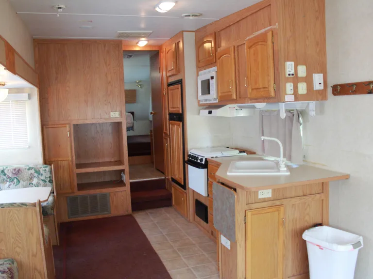 This 5th wheel is a great way to get away from the rest of the world. We love that it has two convertible beds that are perfect for extra campers. It also has plenty of storage space and high ceilings in the main area that makes it feel roomy. Includes basic kitchen necessities and linens for the beds.