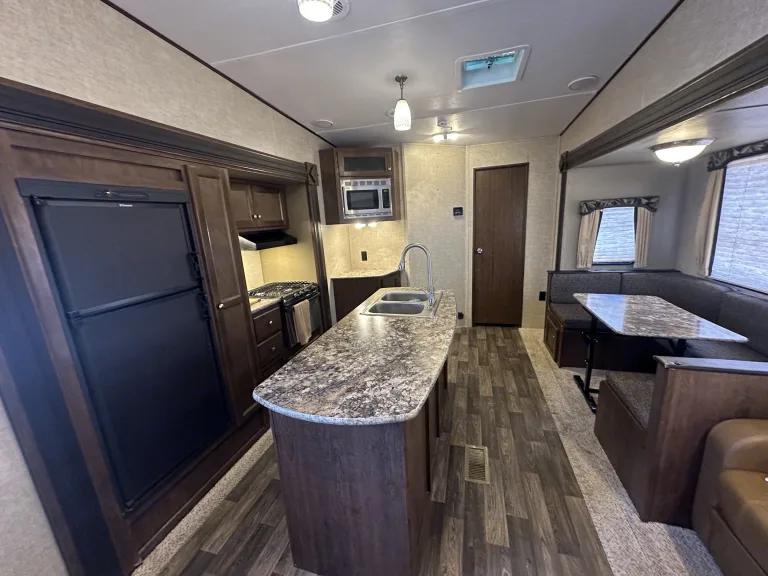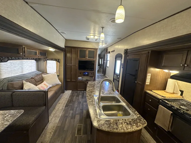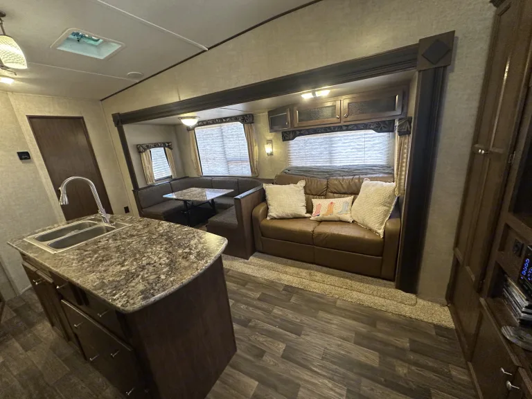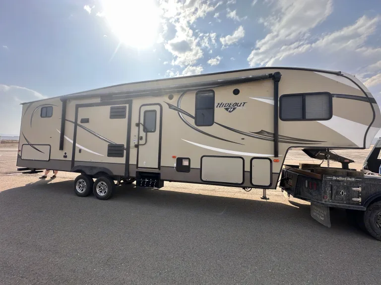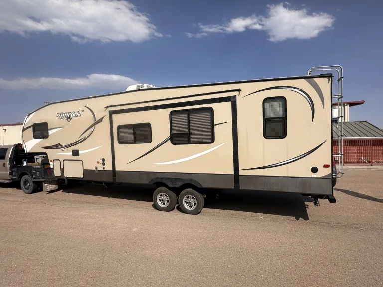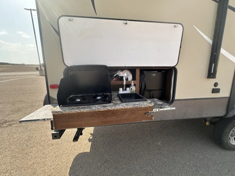 If you’re looking for a camper that fits the whole family or gets all your friends together, this is the camper for you! Whether you’re wanting to explore the desert or relax at the lake, this lifted camper can get in just about anywhere. Formally sleeps 9-10. Loaded with all the linens, kitchenware (both reusable and disposable), pack n’ play upon request (no additional charge). Outdoor kitchen and mini fridge makes outdoor cooking a breeze while lounging under the awning with an American Flag shade screen for added UV protection. And what’s a day well spent without a game of Cornhole or horseshoes, both are included with the trailer!We do offer some optional upgrades! If there is something that you need and it is not listed, please message us to see if your request is something we can accommodate.What's included• Outdoor kitchen