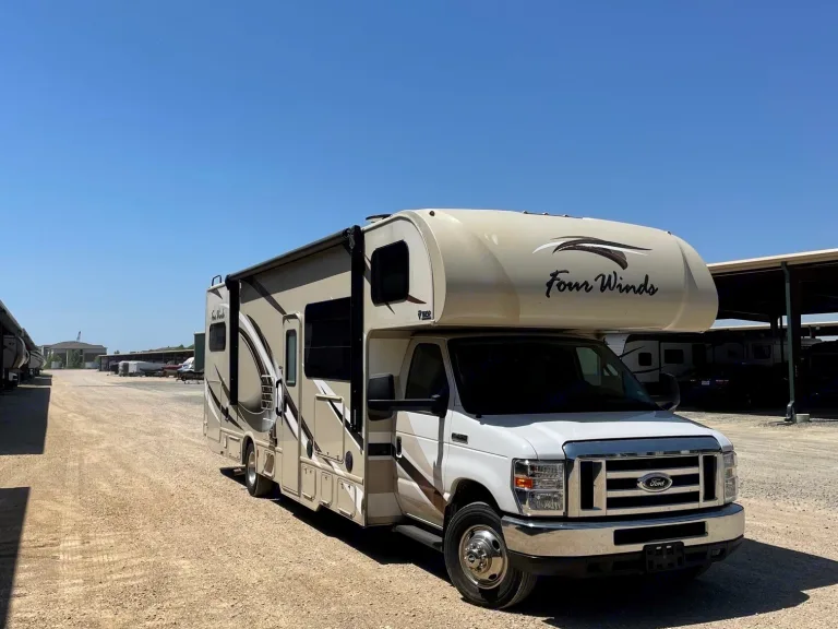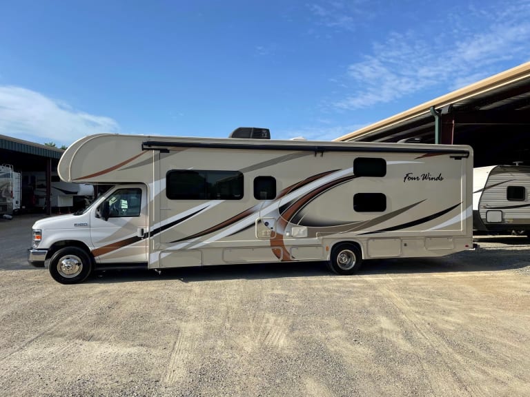 2018 Thor Motor Coach Four Winds Class C RV 31E model is approximately 32 feet 2 inches in length with a Ford E-450 chassis, Ford Triton V-10 engine, bunk beds, fully automatic leveling system & an 8,000-lb. trailer hitch. New features for 2018 include a new front cap with LED clearance lights, tankless water heater, induction cooktop, convection microwave, kitchen pop-up outlet with charging station, new slide-out facia, lighted battery disconnect switch, interior step light into the bedroom, stainless steel lav bowls IPO plastic, exterior lights on all storage compartments and solar wiring prep. This amazing class c RV also has the Premier package which features a solid surface kitchen countertop, roller shades, whole house water filtration system, black tank flush and a coach radio with exterior speakers. Additional options include the beautiful HD-Max exterior color, exterior TV, leatherette sofa, leatherette booth dinette, child safety tether, attic fan, cabover child safety net, upgraded A/C, second auxiliary battery, heated remote exterior mirrors with side cameras, power driver’s seat, leatherette driver & passenger chairs, cockpit carpet mat and dash applique. The Four Winds RV has an incredible list of standard features including heated tanks, power windows and locks, power patio awning with integrated LED lighting, roof ladder, in-dash media center AM/FM & Bluetooth, oven, power vent in bath, skylight above shower, Onan generator, auto transfer switch, cab A/C, auxiliary battery and the Rapid Camp remote system. Rapid Camp allows you to operate your slide-out room, generator, power awning, selective lighting and more all from a touchscreen remote controlWhat's includedRV comes equipped with all kitchen essentials including pots/pans, dishes, cooking utensils, silverware and cups. Also included: camping chairs and an outdoor rug.