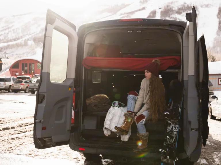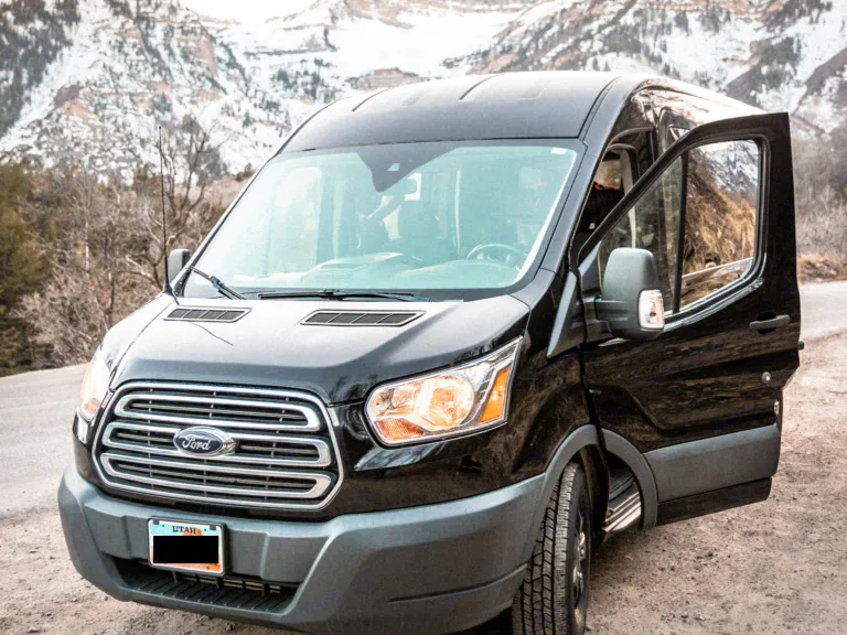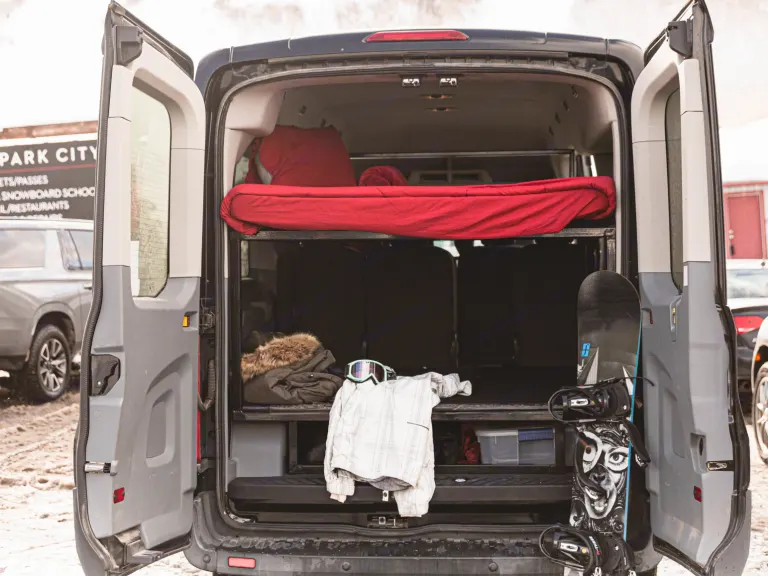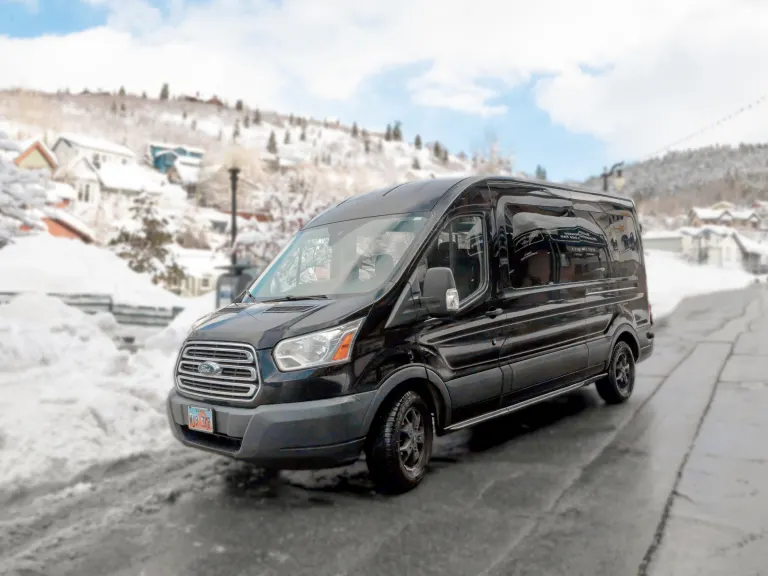 Everyone Jump IN!We've got space for your crew AND their gear. Whether your travels are taking you up to Utah's famous snow, a sleek black-tie event or through beautiful canyon drives, The Transit is big, bad and up to the task. The vehicle is something of a goldilocks–big and spacious, yet an easy dream to drive.A tall roof (6ft standing room!) & wide wheelbase make for a roomy interior, yet by some feat of engineering the steering radius is tight and responsive. The Transit dominates the road. Passengers feel safe inside, and the driver is able to stay agile wherever the road goes.Thanks to the van’s elevated height and big picture windows, you’ll have commanding views of the surrounding landscapes & a sensation of floating over surrounding traffic. The Transit remains remarkably quiet & serene inside, even at an interstate speeds.The cockpit features an 8” touch screen with Bluetooth capabilities for easy DJ access from anywhere in the van as well as a rear view camera for safety & integrated GPS for convenience.My favorite feature of the van is hands down the sturdy steel frame, Queen size bunk beds. The frame of the platforms has been welded and bolted to the frame of the van making it as safe and immovable as possible.At your request, we can remove one or both beds to open up the double platforms for gear, ensuring that you have everything you need for an unforgettable adventure. Don't settle for a cramped, uncomfortable experience.4" memory foam mattresses, breathable bamboo pillows and fresh, clean sheets and blankets, will put you at 5 star comfort no matter your destination.