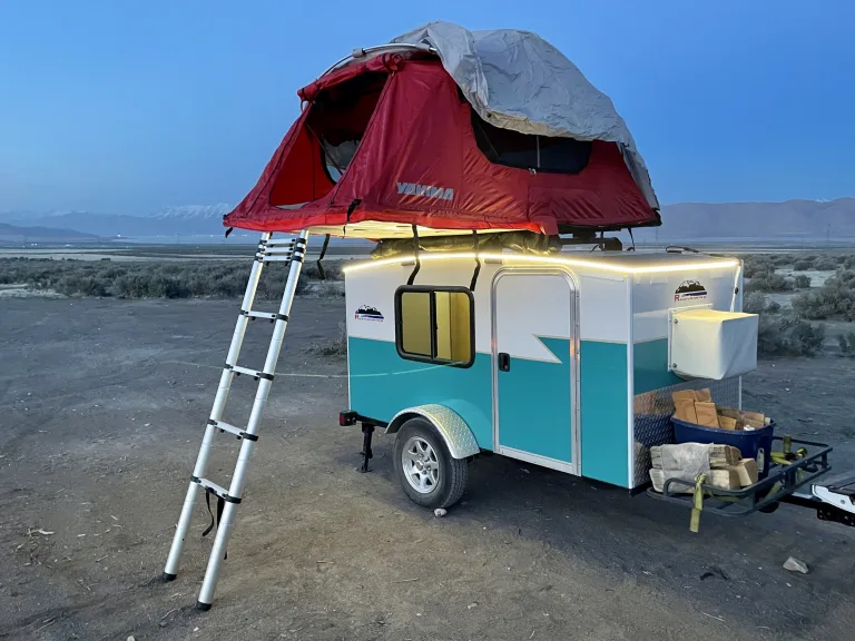 Do you love the Great Outdoors? Are you planning your next adventure in the state of Utah? Do you like camping, but lack the joy of a good and safe night's rest?! ... You've come to the right listing! Runaway with our rig and you're sure to enjoy a memorable experience in the peaceful scenery of Utah!Our trailer comfortably sleeps up to four people - two inside with the option of two more above in the roof top tent. The rooftop tent is a great addition to the Runaway by providing 2 extra sleeping spaces. It’s great for Mom & Dad below and two kids above, with separate sleeping quarters. Or vice a versa if the kids are too young, or even if Mom & Dad prefer the sky view to look up at the stars from bed!For the main power source, we have mounted a 100-watt solar panel to the roof that connects to a power station inside. This provides power on the go while camping for small power applications. Thanks to the solar power, it's constantly topping off the battery with free power! This will easily power the indoor and outdoor LED strip lights. It can also charge your cellphones or small electronic devices like a drone. An extra feature of our rig includes an air conditioner (requires 120 volt).This Runaway Camper, model: "Cool Camp," features two access doors with enough room to transport all of your gear. There is also an exterior front rack for extra storage for things like firewood, gas or propane. An additional feature of this Runaway is the rear receiver hitch for mounting your own bike rack and mountain bikes. It is so lightweight, practically any vehicle with a hitch can tow it (weighs just under 900 pounds). It requires a 4 pin trailer light connection (we have included a 4 to 7 pin adapter). We also include an adjustable hitch to properly fit your vehicle height.Give our Runaway camper a try for your next adventure!What's included-7 gallon water jug