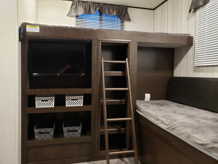 Never used a travel trailer before? No worries! We do everything for you! Delivered to your desired camp site, set up, tutorials on everything you need to know for your stay, then taken down and picked up! All you have to do is show up!**Newer camper with great amenities! The trailer features a modern fun décor and sleeps 10 comfortably. A private master bedroom with a queen sized bed and two closets. The general living space has a dinette that can seat 6. The dinette also collapses into another bed capable of seeping 2 more people. The comfortable love seat converts into a bed, comfortably sleeping 2 children. The living room is equipped with a Bluetooth stereo and Smart TV.In the back of the trailer is a bunk house that can accommodate 4 to 5 people with plenty of room for the kids to enjoy their own space. There are 3 twins beds(one is a pull down), and two twin pull out chairs with an entertainment center with another Smart TV.Next to the bunkhouse you will find a full bathroom and shower with sliding glass doors. Outside access door allows company or wet and muddy feet to use the restroom without making a mess through the living area. There is also an outdoor kitchen with sink, refrigerator and a hot plate.Other features include: Air conditioner, propane heater, Bluetooth stereo, interior and exterior speakers, electric awning, outdoor shower, LED outside lights, camping chairs, towels, wash rags, fitted sheets for every bed, portable sewage container , water filter, and kitchen supplies. (A list off full supplies will be emailed after booking)We pride ourselves with keeping our trailer clean and modern to give our guests a comfortable stay while camping. We expect our guests to return the trailer in the same condition it was received in.We now offer contactless booking!! Message us for deliveries longer than 70 miles.What's included• Towels and washrags