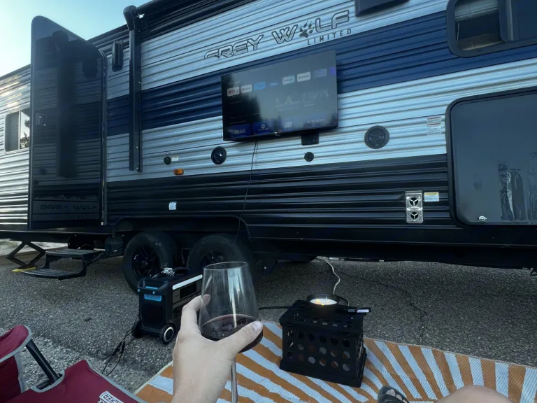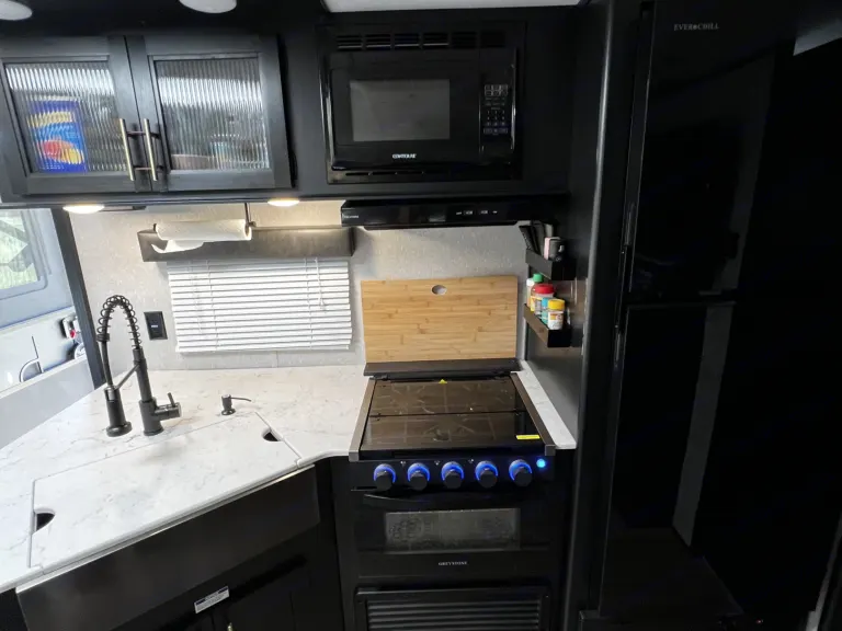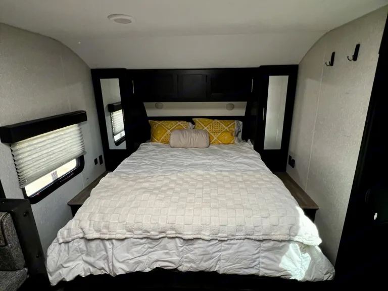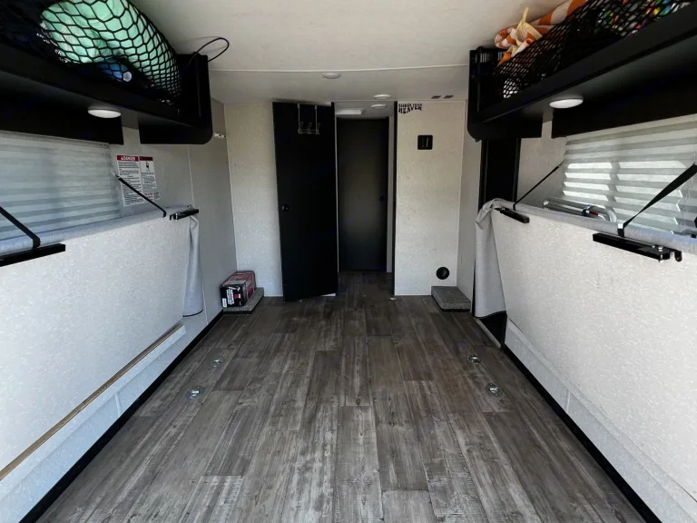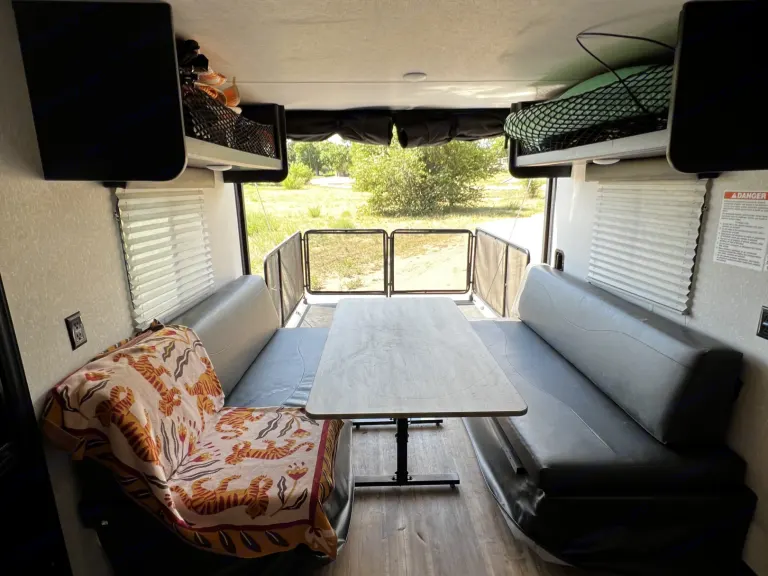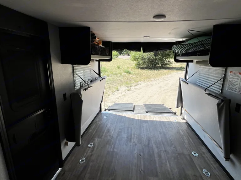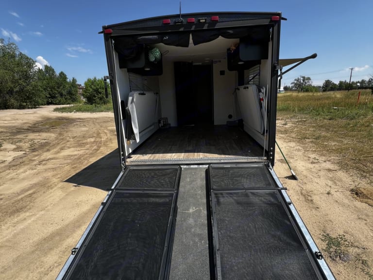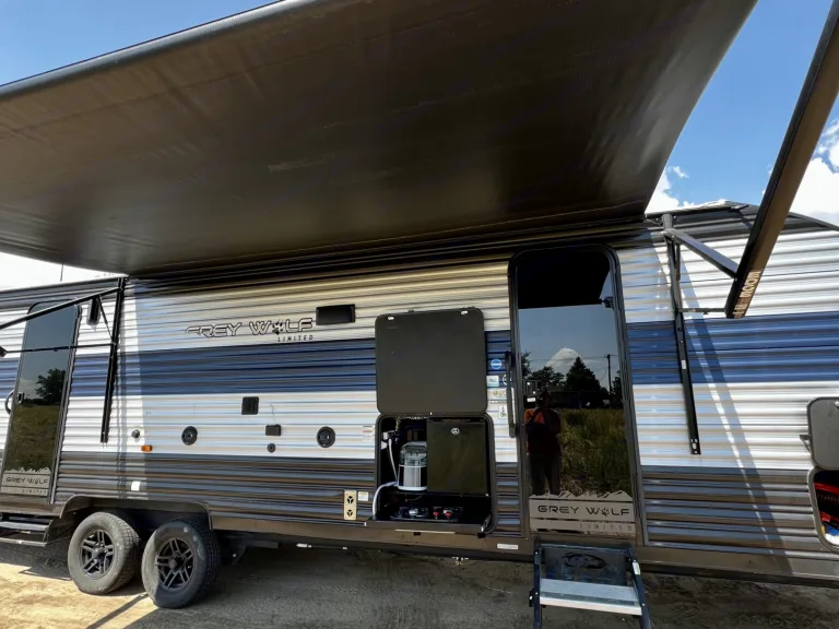 This well kept pet friendly 2022 Cherokee Grey Wolf Toy Hauler is ready for your next adventure! Spacious enough for 4 people & your Motorcycle, side by side, etc.There is a queen bed in the main living area & seating area in the back converts to 2 twin beds. The main living area & the garage area are joined by a Jack & Jill bathroom. The garage is 132x92 inches.This cozy Toy Hauler is equipped with A/C & heat. Its fully functional kitchen features a refrigerator, kitchen sink, microwave, 4 burner stove, & over. Outside you also have a mini fridge, ice maker, & 2 burner stove.The TV can be mounted in the wall in the main living area, in the garage area, as well as outside under the 15 foot awning! Perfect for watching TV as you grill n’ chill outside.The ramp to the garage area turns into a porch. The porch has a set of screen curtains you can zip & velcro close- which is amazing on the breezy nights!What's included-1 set of Queen bedding
