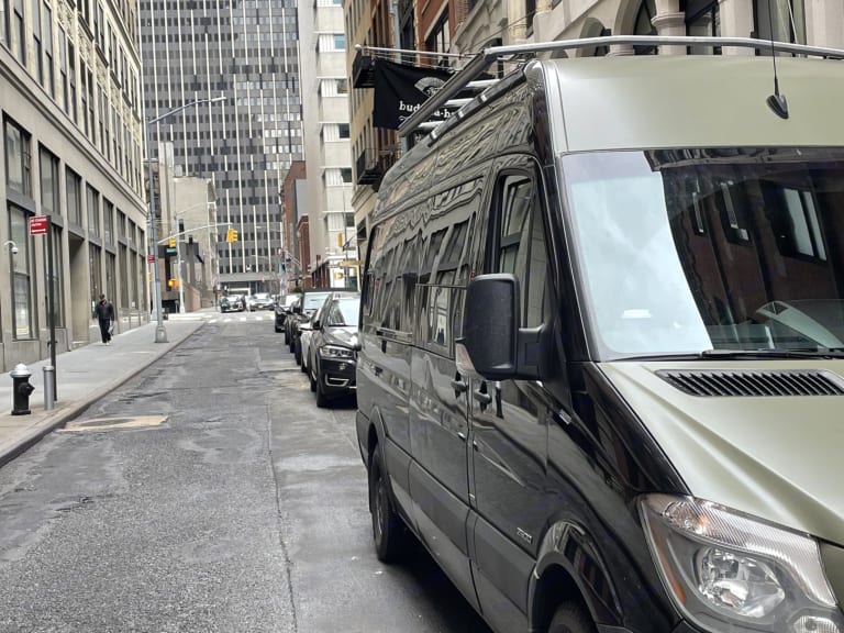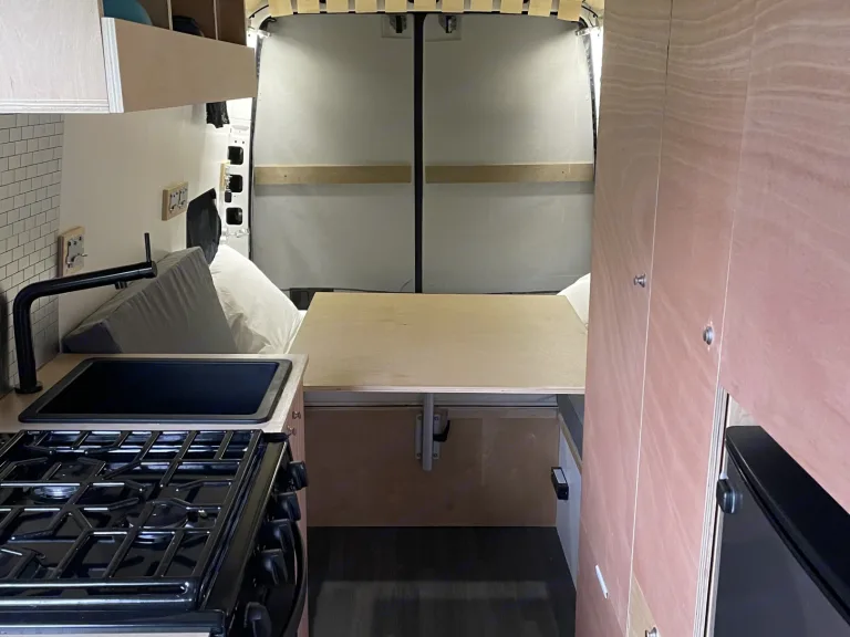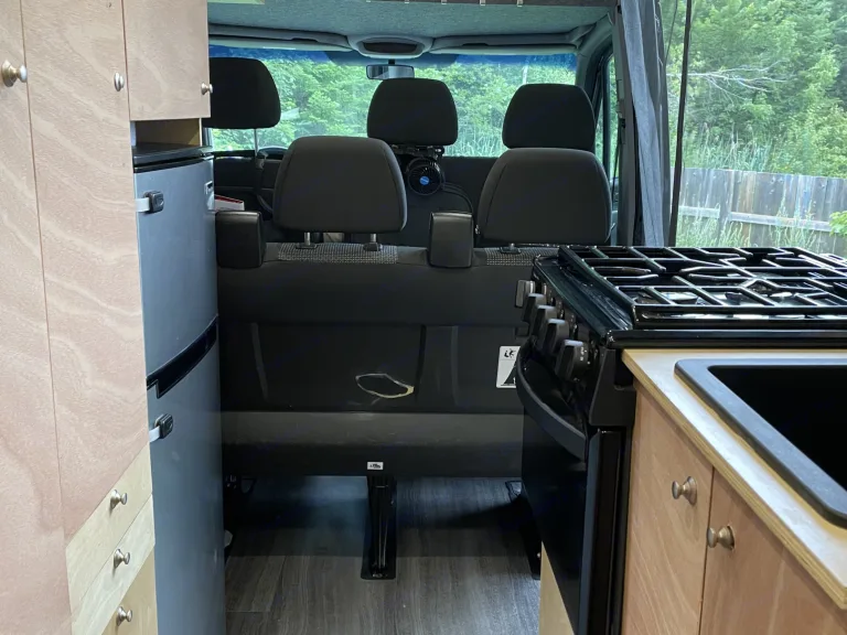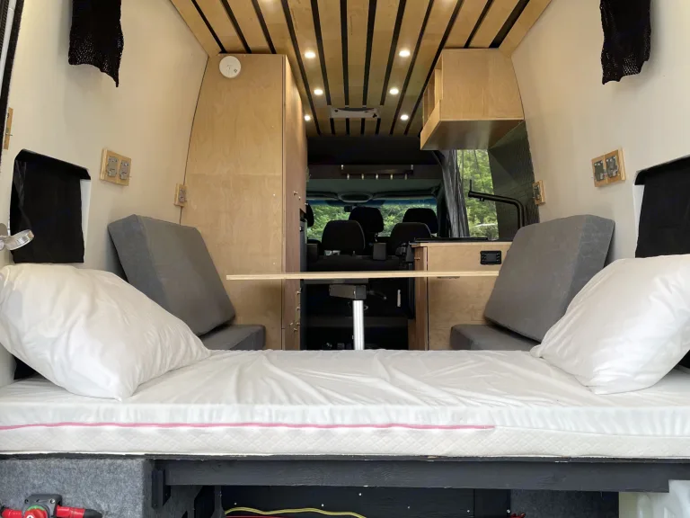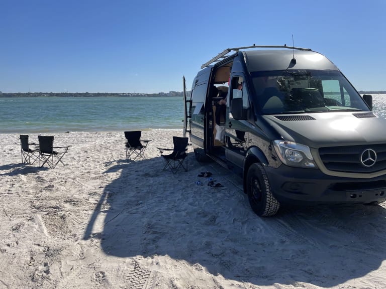 Sprinter version longue avec toit haut. Diesel! 3 places assises et couché. Chauffage, ventilation, réfrigérateur avec congélateur, table, banquette, poêle au gaz avec four. Évier de cuisine avec robinet. Batterie avec système solaire. Idéal pour les familles, jeux de société inclus. Génératrice disponible avec supplément. Support à vélo disponible avec supplément. Possible de laisser votre véhicule sur place pendante le voyage. Parfait pour les voyages en nature!