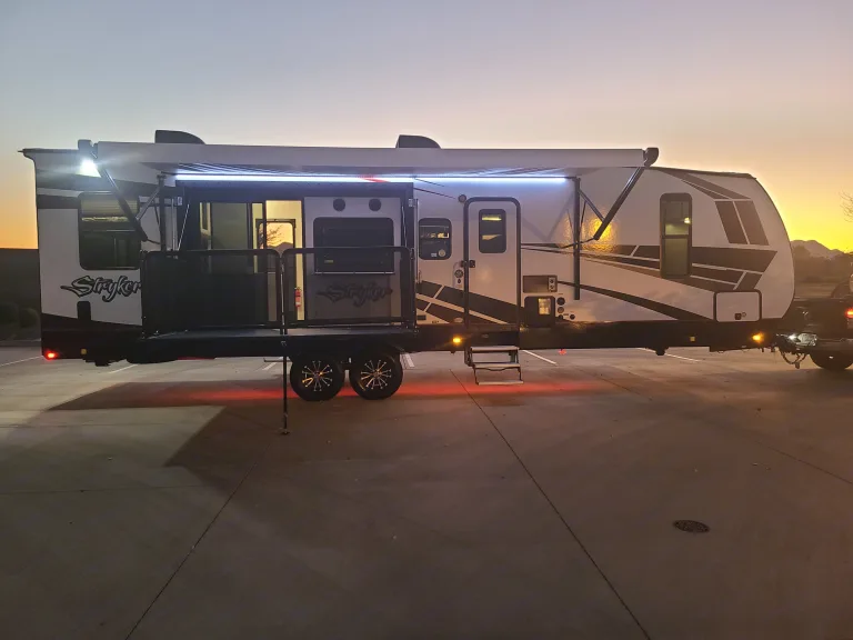 This is our brand new Stryker, full of entertainment. How many toy haulers do you see with a front porch with a built in tv? It has a separate garage, and the coach sleeps 6 or more. This unit has 2 A/C units for the Arizona sun, and has a 2nd door straight into the garage for when you are done shredding the dunes or the motocross track, preventing dirt tracked into the main cabin. In the bathroom you will find a full size residential size toilet. The 5 comfy recliners will leave you no choice but to relax. There are 4 tv's, 3 DVD players, and a variety of board games and DVDs for you and your family to enjoy. This unit comes with a 10 gallon hot water heater, and 30 gallons of fuel for all your toys. This unit is equipped with a full set of kitchen items including a blender, coffee pot, dishes, steak knives, various cooking and eating utensils, containers, and products for easy storage and clean up. Outdoor table, chairs, a Coleman Roadtrip 285 propane grill with camp propane bottles will be provided per request at no charge! Linens for the 3 beds, and bath towels will be provided. The coach will be thoroughly cleaned and disinfected after each rental. We clean and sanitize the tanks after each use. The fuel tank, and propane will be full at pick up and must be returned full. The water tank will be filled per request at no charge and can be returned empty. This is a brand new unit, please treat it as such and with respect. Thank you.What's includedThis is our brand new Stryker, full of entertainment. How many toy haulers do you see with a front porch with a built in tv? It has a separate garage, and the coach sleeps 6 or more. This unit has 2 A/C units for the Arizona sun, and has a 2nd door straight into the garage for when you are done shredding the dunes or the motocross track, preventing dirt tracked into the main cabin. In the bathroom you will find a full size residential toilet. The 5 comfy recliners will leave you no choice but to relax. There are 4 tv's, 3 DVD players, and a variety of board games and DVDs for you and your family to enjoy. This unit comes with a 10 gallon hot water heater, and 30 gallons of fuel for all your toys. This unit is equipped with a full set of kitchen items including a blender, coffee pot, dishes, steak knives, various cooking and eating utensils, containers, and products for easy storage and clean up. Outdoor table, chairs, and propane grill will be provided per request at no charge! Linens for the 3 beds, and bath towels will be provided. The coach will be thoroughly cleaned and disinfected after each rental. We clean and sanitize the tanks after each use. The fuel tank, and propane will be full at pick up and must be returned full. The water tank will be filled per request at no charge and can be returned empty. This is a brand new unit, please treat it as such and with respect. We don't mind if you leave Arizona, however it can not leave the United States. Thank you.Other things to noteThe following are fees if rules are not followed:Cleaning $100.00, if unit is returned dirty.