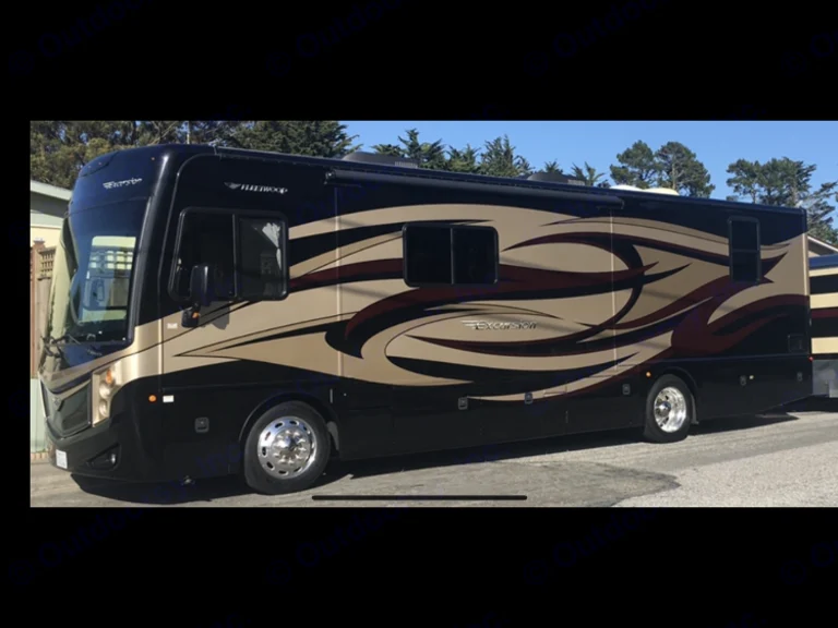 33ft Fleetwood Excursion , Single pop out with a full sized refrigerator . Separate master bedroom with door and king bed , Also a cab over sleeper for 2with a kitchen conversion easy up that can accommodate 2. Very driver friendly .Also has easy hook up for water and power ,cable ,And Sanitation hook up.