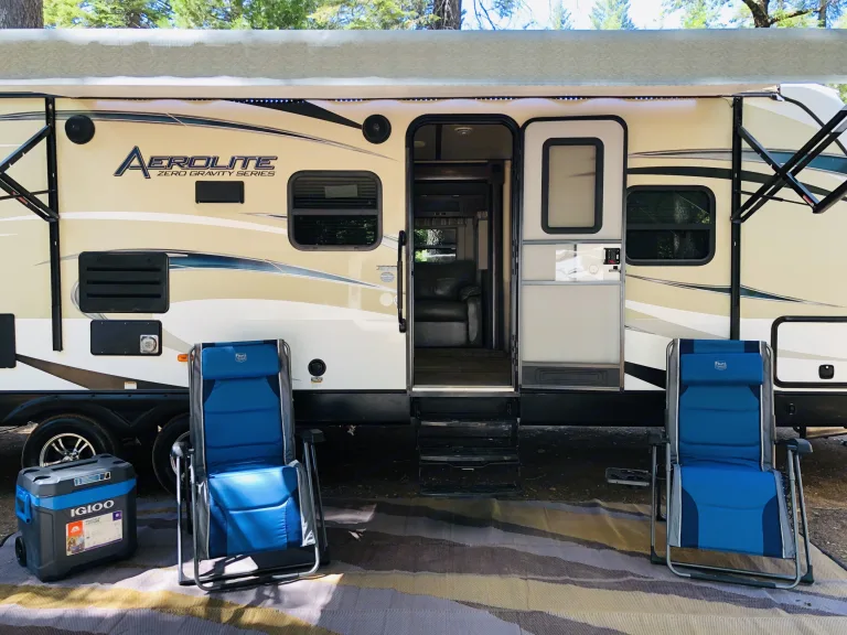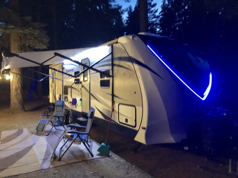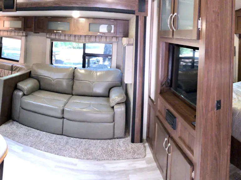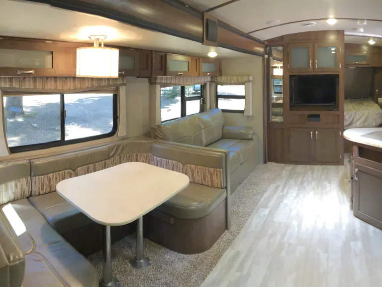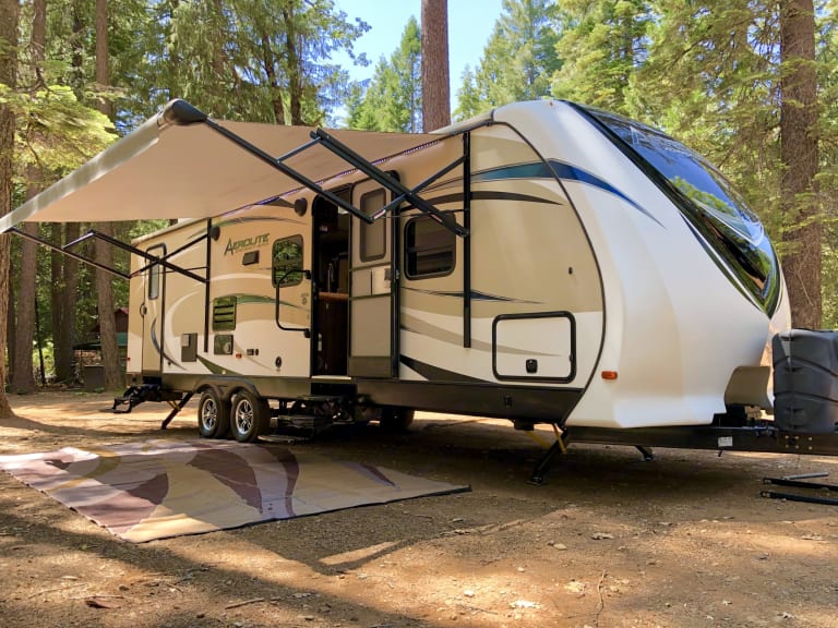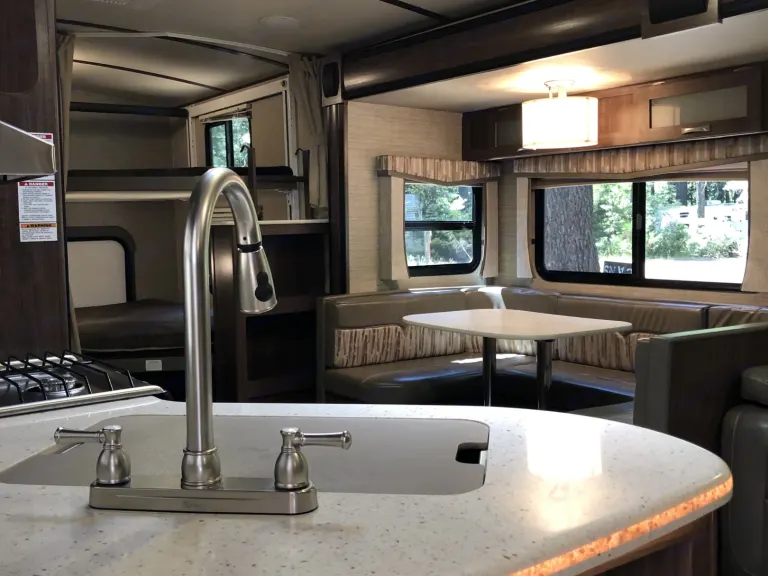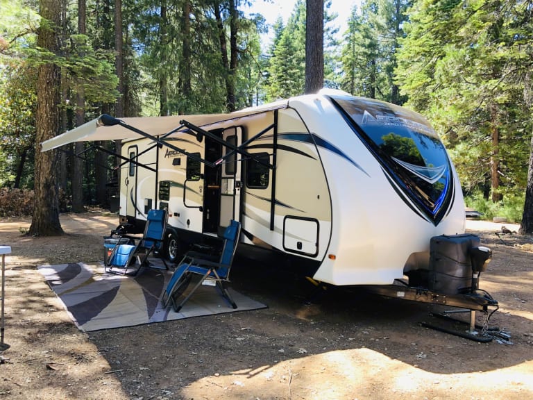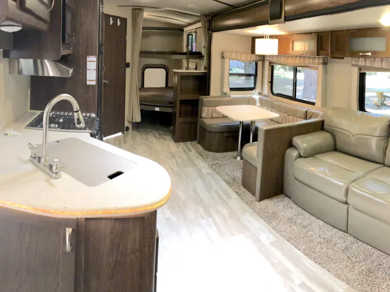 This beautiful new Aerolite luxury bunkhouse has room for the whole family! We deliver within 2 hours of Sacramento. Adjustable hydraulic bunk beds allow you to have up to 3 full size beds. There is a king size walk around bed with plenty of storage, a large pantry, super slide with U-dinette and a couch that both make into beds. It is so roomy! LED lighting, speakers throughout.