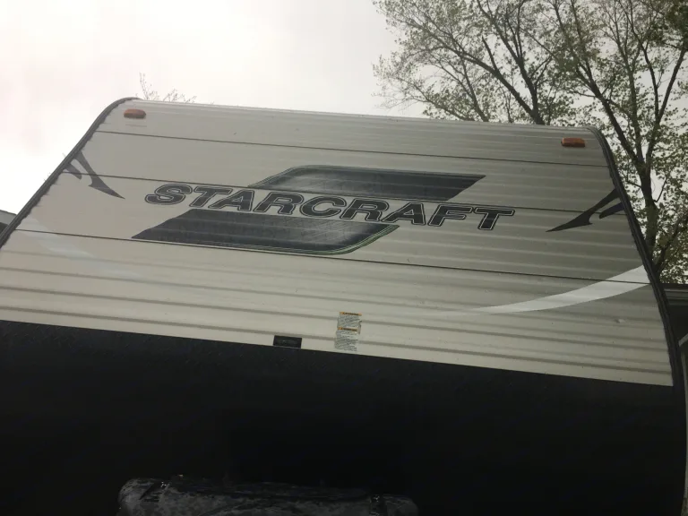 Spacious 2015 travel trailer with outdoor kitchen and double awning.
