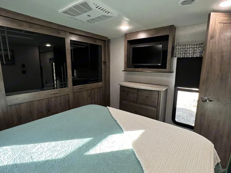 Take the family on the trip of a lifetime with this Sandpiper fifth wheel! From its private bunkhouse suite equipped with two twin size bunks and a futon that folds into a full size bed in the back and a private master bedroom in the front, you will have plenty of space to bring along family and friends for quality time. The two entry doors give you convenient access into this unit so that you can load up your luggage and camping gear quite easily, and the kitchen island will come in handy as you prepare dinner each evening. This 5th wheel includes 1.5 half baths and an outdoor kitchen.Pets are welcome but should be approved by before booking.This IS Delivery Only!What's includedPROVIDED FOR YOUR STAY-Outdoor Chairs (6)