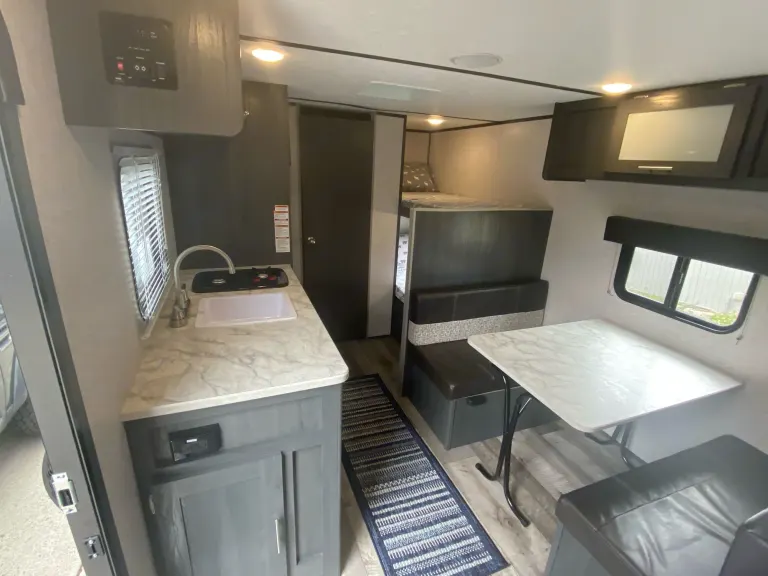 Our 2021 Aspen Trail Camper Trailer is our home away from home and our kids portal to adventure. Our family of 6 loves camping and everything outdoors. This little camper is a perfect fit for a family of 5 (or 6 with little ones) with all the amenities and comfort for year round camping, dispersed (remote) or RV sites with hookups yet it's still light enough to tow behind most mid-size SUV's (3000lb rating).It comes equipped with a 2 burner counter top gas stove, electric fire place heater, kitchen sink, full bathroom/shower, dinette with seating for 4, A/C, microwave and fridge. Sleeping quarters are a queen bed up front, twin size bunks in the rear and a dinette conversion to sleep 1 or 2 children. Dinette table comes out and can be used as a picnic table outdoors for cooking or eating. Hard wood floors, dark cabinets and electric fireplace heater gives it a cozy feel that will make you never want to leave!Our trailer comes fully equipped to make sure you enjoy the most out of your stay. Kitchen comes fully stocked with stainless steel utensils, mugs, plates/bowls, pots/pans for cooking, cooking oil, Cuisinart Coffee Maker w/ cone filters, herbs/spices, grilling spatula/fork, paper towels and marshmallow roasting sticks!Fitted bed sheets, towels and pillows are also included for 6 individuals. Queen bed has a memory foam pillow topper for extra comfort. Storage space at the front gives room for camp chairs, fishing poles, firewood and other adventure gear. If you're camping without RV hookups, we offer our WEN 56203i Super Quiet 2000-Watt Portable Inverter Generator for rent.