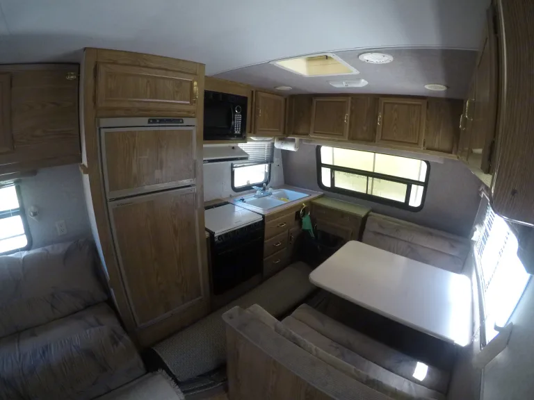 Used, in fair condition but has the necessities for a week(end) trip. one main bed, fold down sofa, dinette that folds down into a bed. Laminate flooring with room for 1-2 people to sleep. Suitable for burning man with solar powered lights, propane for the kitchen, generator for air conditioner and lights.A couple of the windows do not open correctly and have been sealed off. The awning was taken by the nevada wind.