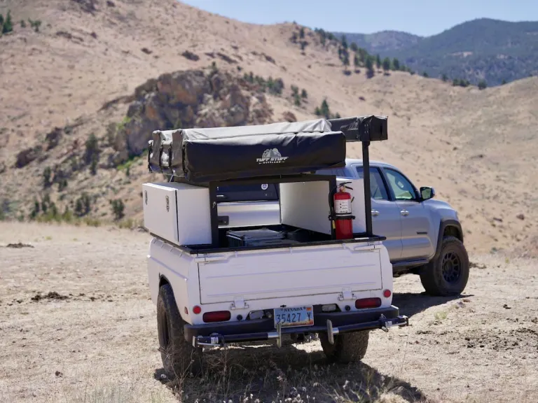 This is a custom Overlanding Trailer. It is based on a 1978 Ford Courier truck bed trailer. It has been modified with a custom steel rack that holds a 4 person roof top tent. It has upgraded leaf springs, shocks, off-road tires, 270 Degree awning, kitchen, water, battery and 12v fridge.In this configuration it makes a great Overlanding trailer that can carry all your camp gear down any road that your SUV or 4x4 can go down. Camp setup is easy and fast and includes sleeping for two adults, or a family of 4 with small children. It can carry up to 4 bikes on a hitch mounted bike rack.What's includedRoof-Top Tent