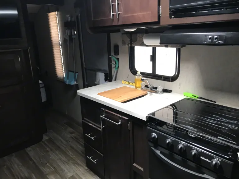Our RV is very spacious and comfortable for 5 people. It has two full size bunks, a kitchenette that turns into a bed, a pop out and a queen walk around bed. We have updated the queen mattress to a softer version, and the bunk beds have additional padding as they were very hard before. There are speakers inside and out that can hook up to anything with an audio jack.