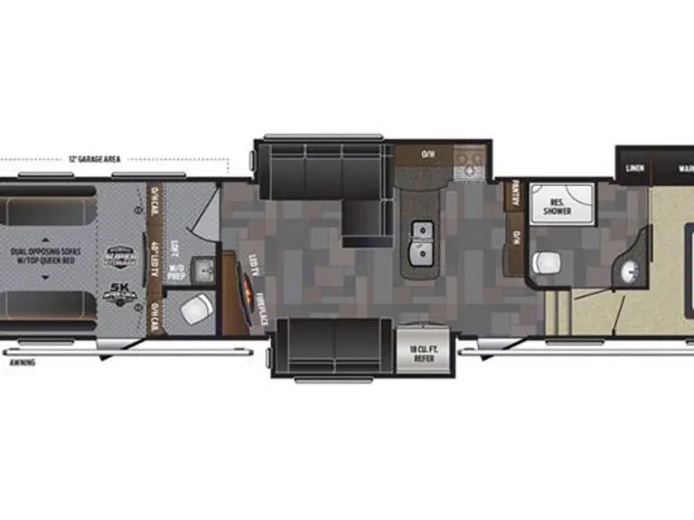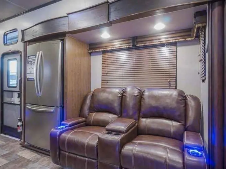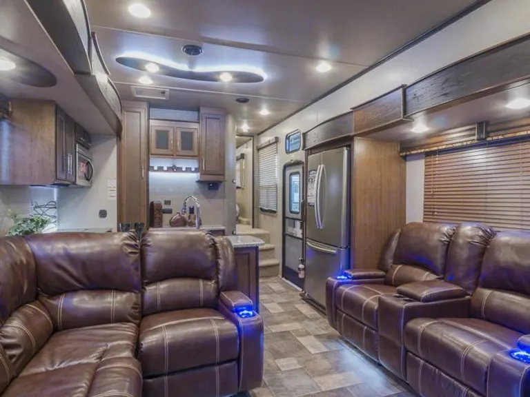 One King bed, two double bunk beds, a pull out couch and single bed loft. LED TVs, fireplace, full size residential refrigerator, kitchen island, 4 recliners, indoor and outdoor radio and speakers, recessed LED lighting throughout, solid surface countertops, spacious living room, air conditioner, tinted privacy windows, large closet and tons of storage, toy hauler garage and a 100+ Gallon Freshwater tankIncludes: plastic utensils, plastic cups, paper plates, paper bowls, trash bags, toilet paper, paper towels and cleaning supplies. We provide one full set of bedding with two pillows for the master bed. We also provide two bath towels. Additional linens available.Also includes: Air conditioning, shower, sinks, toilet, hot water heater, propane, stove, refrigerator, microwave, oven.Please see add-on options for additional items available for rent.Delivery is available upon request and approval. If you would like to pick up the unit, a standard fifth wheel hitch or gooseneck with proper adapter is required.