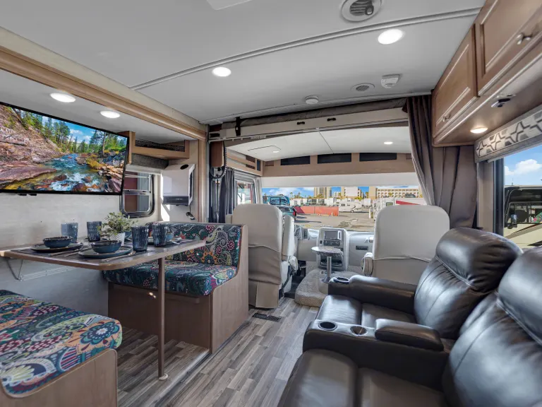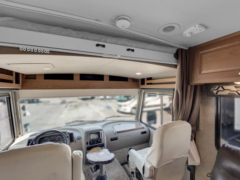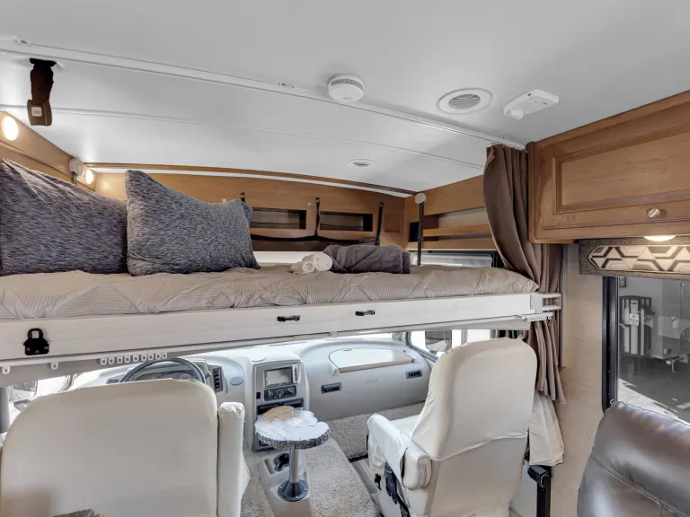 RV rental interior: a cozy over-cab bed sits above the driver's cockpit and passenger seats, ready for adventure.. Winnebago Vista 2017