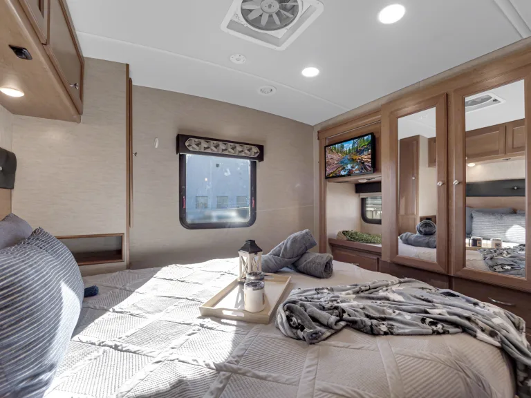Bright RV rental bedroom: large bed with striped pillow & patterned blanket, window, overhead storage, TV, and mirrored closet.. Winnebago Vista 2017