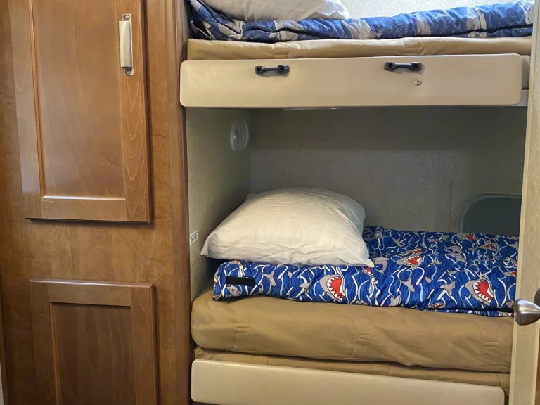 This IS A Beautiful, Bunk House Trailer.Inside includes a triple bunk bed for the kids plus a queen bed with privacy curtain and a dinette that turns into another queen size bed. TV, DVD player, Bluetooth connected radio with inside-outside speakers.Comes fully stocked with dishes, silverware, pots/pans, cups, mugs, 1 folding table, 1 battery powered lantern, 1 lrg outdoor RV mat, collapsible garbage can, 2 full propane tanks for you to use. Linens and pillows for the two RV Queen size beds.I have a generator for dry camping at a fee. Gross vehicle weight: 5400 lbs. Required TO Rent: Vehicle with 2 inch towing receiver hitch and brake assist, 7 prong electric connector, and towing capacity of 7000 LBS.