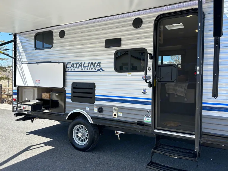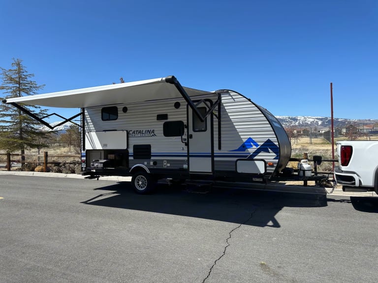 We are so excited to share our brand new camper with you. This is our first season renting out our travel trailer and we can't wait to hear the memories you make with your family on the road. This camper is brand new and stocked with all new items from bumper to hitch!The Catalina is a small travel trailer with a big personality! Our trailer is brand new (purchased in 2023) and ready to hit the road with your family. This light-weight model makes it easy to tow and has a slide out to create additional space at your destination. Measuring from bumper to hitch at 23'1" and about 4200 lbs. dry weight, making it easy to tow with a SUV or any pick up truck.The inside sleeps 8 and is complete with oversized 3/4 bunk beds, a queen murphy bed that turns into a sofa to maximize space and add seating. The interior is equipped with a large 10 cu. ft. refrigerator, private bath, kitchen, U-shaped dinette, and upgraded AC unit to keep you cool during the summer. The RV is fully stocked with basic needs like linen, bath towels, kitchen needs and cleaning supplies. Please reach out for the full list of what's stocked in our camper. The outdoors boasts upgraded JBL bluetooth speakers, outdoor kitchen, water source, multicolor LED lights, and 13 foot power awning.Hit the road ready to go with our integrated solar battery charger or chose to upgrade to our generator for an additional fee. We also have a variety of activity items availble to rent for future memory making.A brief orientation and pre-camping checklist will be completed at time of rental as well as a signed contract. If there is anything you think you may need in addition to what we provide, feel free to ask and we will do our best to accommodate.Delivery/pick up and set up is available.