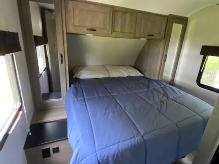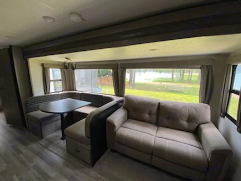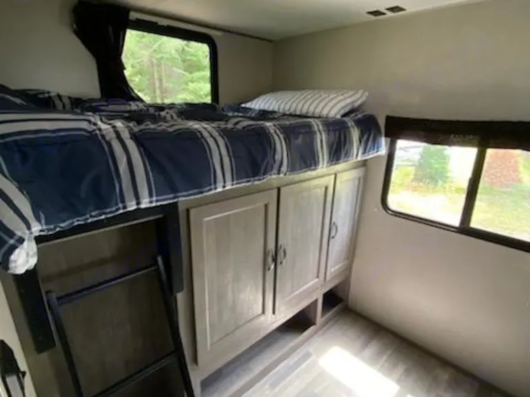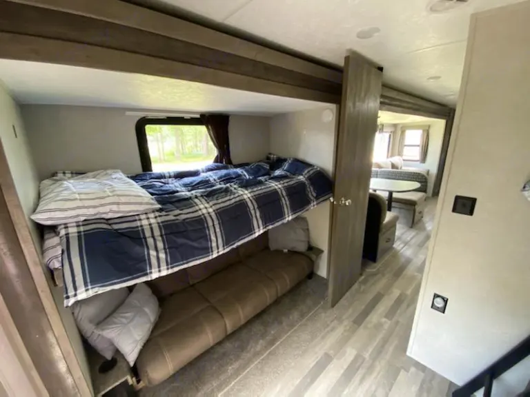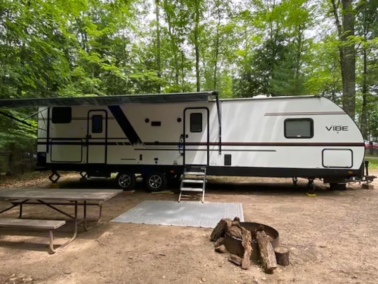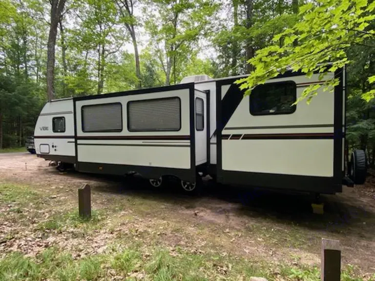 2020 Forest River Vibe, loaded with all amenities to make your camping trip a wonderful experience! Sleeps 8 comfortably and has a separate bunk room for the kids/guests! No towing is needed. We deliver the camper to your destination within 45 mile radius of Rhinelander, WI. The camper will be set up for you upon arrival, and we'll walk you through it to show you how everything works (unless you don't want us to). It's easy... Show up, camp, enjoy!What's includedCamper comes with fresh linens, kitchen supplies, 2 full propane tanks, full water tank, power awning, Bluetooth radio with indoor/outdoor speakers, A/C, heat, refrigerator, outdoor kitchen with refrigerator, 4 director style camping chairs and 2 folding chairs, Coleman Roadtrip propane grill with outdoor grilling tools, pudgy pie makers, picnic table canopy, and more. Also, each bathroom comes stocked with toilet paper, 4 bath towels, 4 wash cloths, and 2 hand towels.Recommendations A few things to note about your destination: