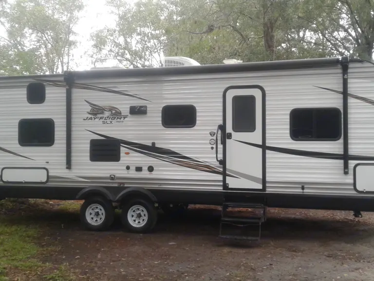 This beautiful 2020 Jayco Jay Flight 267BH is a dream glamping vacation for all. We offer delivery within 150 miles for a fee. This camper has Queen bedroom. Full size bunk beds. Clean bedding included with rental. Full kitchen (fridge/freezer, microwave, oven, double sink, coffee maker). Bathroom has toilet with RV approved toilet paper, tub/shower, sink, wash cloths & bath towels. Dinette with storage. Pull-out couch. 32" Smart TV in living room. Outside awning has LED lights & speakers. Plenty of storage inside and outside camper. We are currently stocking camper with paper plates, plastic forks, knives, spoons, cups, trash bags & trash can, dust pan & broom, outside chairs, charcoal grill & gas grill, outside shower. All the basic stuff we think should be in there. Full inventory list available. All included in rental price.Hitch set up provided.