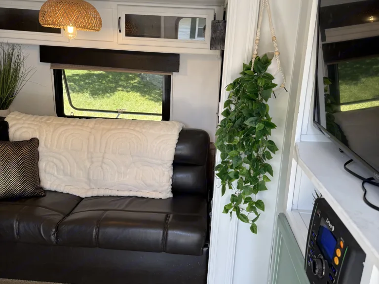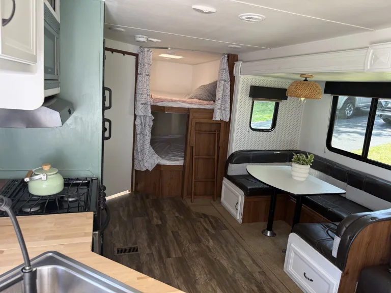 The bathroom has its own entrance door from the outside and has a shower. It also has large capacity hot water tank which is nice for hot showers on cold nights. Bathroom sink is custom made butcher block with a new faucet. Blue tile throughout the bathroom makes it easy on the eyes.Everything has been redone in this camper. Everything is new and painted and we hope to give a light boho vibe that’s functional for the entire family.We also have two Electric bikes with a kids pull cart you can add on for a fee. We also have an electric scooter you can add on. Things we can put in the camper for no additional cost: a small charcoal grill, folding chairs, coolers, etc. if you need anything we’re here to make it the best camping “glamping” trip for you!*pet friendly with $50 deposit*What's included•Cooking utensils