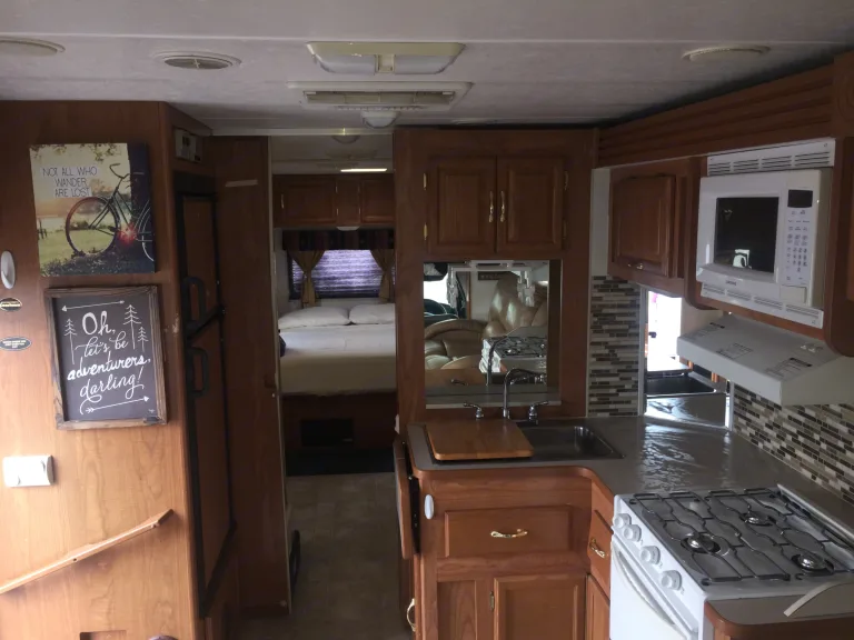 This 2003 with less than 60,000 miles has been updated on the inside with fresh kitchen/bath tile, updated curtains, and a new leather love-seat recliner. Complete with a private bedroom with a plush/normal full sized mattress, 1 manual slide out, a manual awning, a dinette, plenty of storage space, and a Blue Ox tow system. (If you have a bike rack, that can be attached!) The bunk above the cab cozily sleeps 2. No TV anymore - get outside and enjoy! NO Generator- you will need to be fully hooked up, dry camping, or bring your own generator.There are a few small cosmetic issues: a curling iron burn on the side of the bathroom sink, the slide-out needs a little push as it's sliding (due to the new recliners being heavier than the stock couch), one of the kitchen drawers is off the tracks and a bedroom drawer is off the tracks, a few broken blinds. Little stuff...no biggie. She runs great and is super comfortable.Toilet paper, bath towels, and fresh sheets for full-sized are bed provided. Please bring any other blankets you might need. The kitchen is lightly stocked with pot, pan, coffee maker, plastic utensils, paper plates, plastic cups.The owner's manual as well as a personalized "Lady Luck" manual will be on the dinette table to help you navigate your way around the rig.Must be hooked up to a 30-amp outlet!Must Empty ALL Tanks Before Returning! If tanks are not completely dumped prior to return, there will be a $75.00 fee.