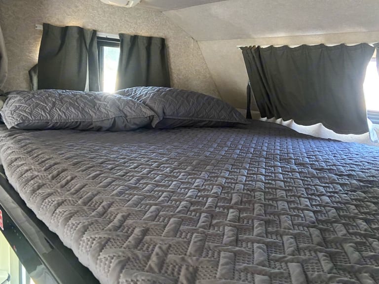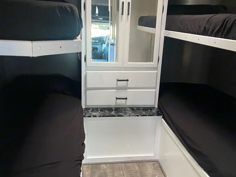 Has a unique floor plan with rear bunk beds in the back so perfect for a family or guys/girls trip so each can have your beds in comfort.