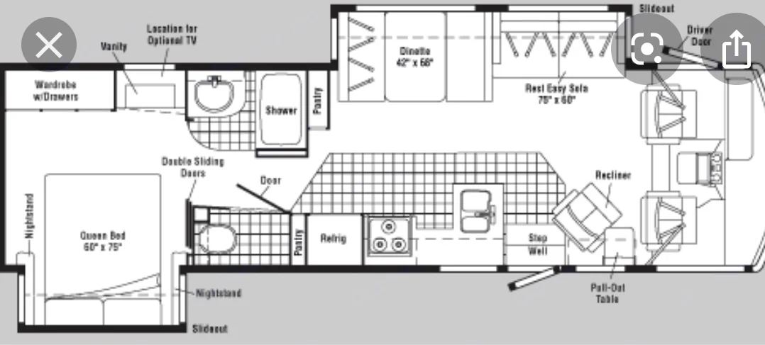 Private bedroom with slide out, TV and sliding door to bathroom. Sleeping quarters at both dinette and sofa. Sleeps 6. Fully loaded kitchen with all items needed.