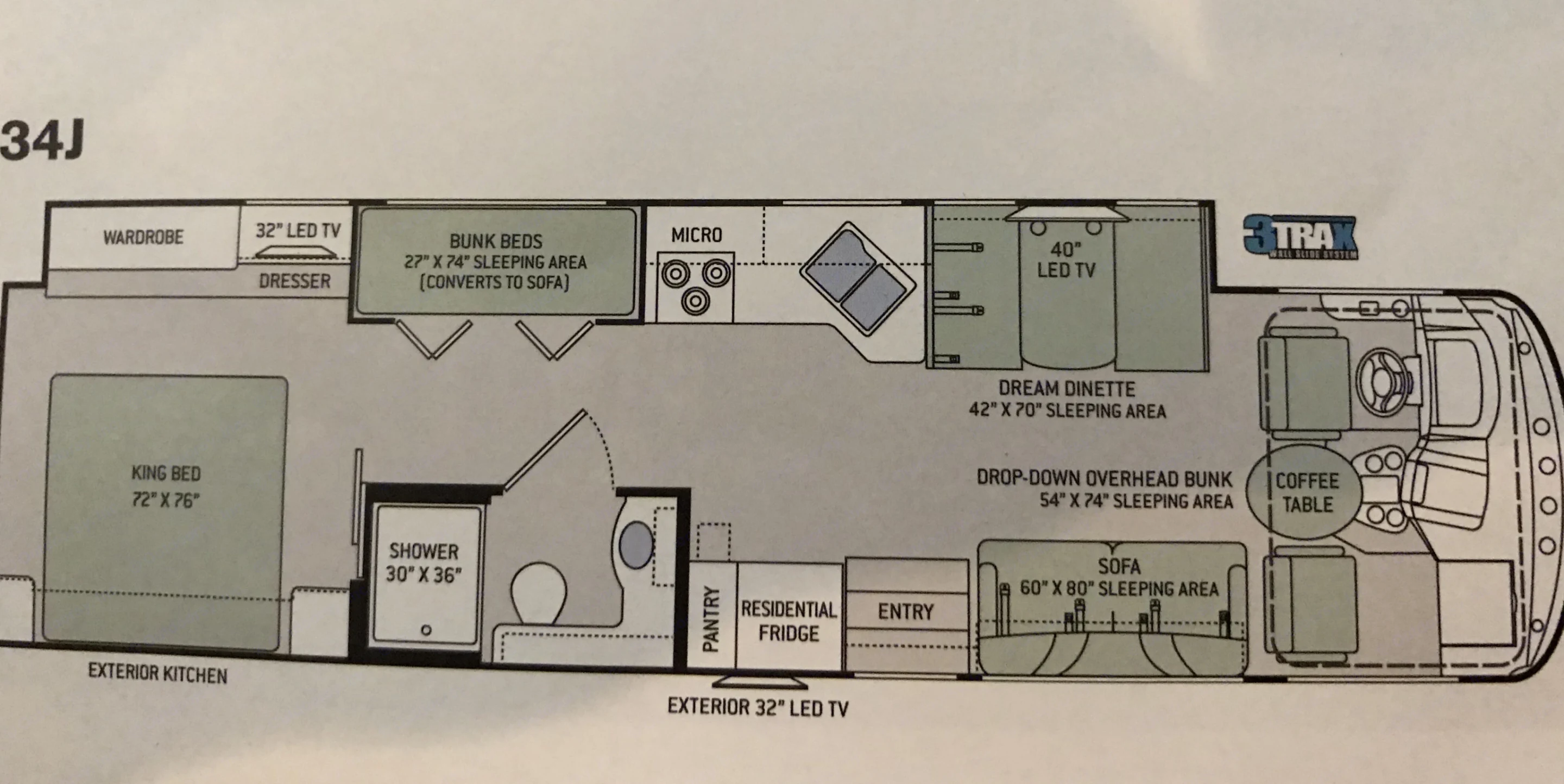 Very clean. 6 beds includes 2 bunk beds, 6 TVs( 1outdoor tv), outdoor sink and fridge. Spacious and rides smoothly. Very easy to drive.