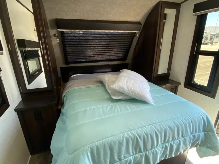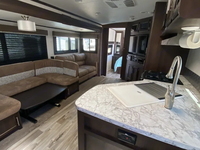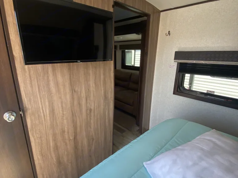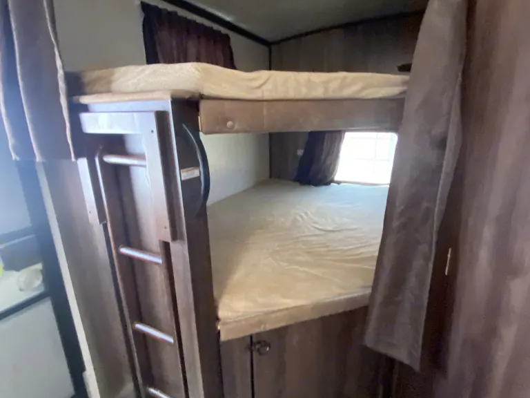 great for everyone, bedroom with Queen bed and closet with vanity, bunk beds are full size, large bathroom with extra storage, full large kitchen, u-shaped dinette/sleeper, sofa sleeper, heater, a/c, awning, super roomy, 2 tvs, outside kitchen. You’ll love this trailer for a small or large family.