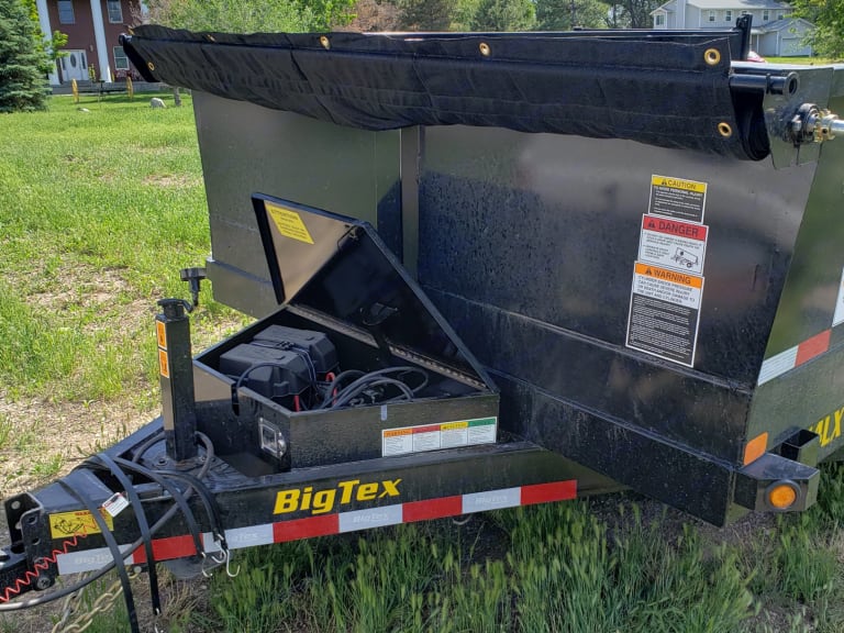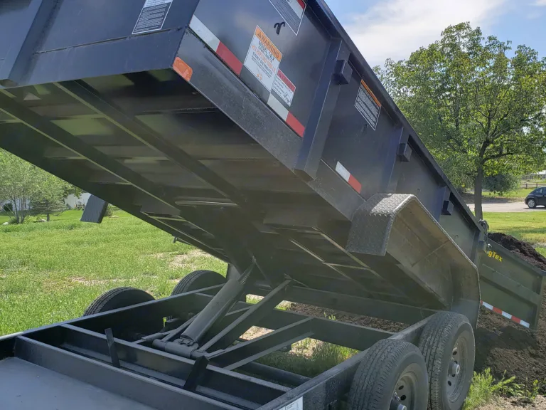 Inner bed length is 12ft in length 7ft width by 24in high. Overall size is 16.1ft in length by 8.5ft wide by 4.5ft high from ground up, and weighs 3000 pounds. Has 4 heavy duty tie down rings welded in the corners of bed. Can handle up to a 10k load, has 2 5/16 ball, with 7 round electric plug. All four wheels have electric brakes for your safety. 15ft cord for controlling hydraulic dump-bed combined with tailgate that can dump in three different ways for easier dumping. Comes with two 5ft ramps to load equipment, two 7000 pound axles, and a 18000 pound adjustable tongue. Includes tarp. Can haul all different types of materials, NO Large Concrete OR Bolders Allowed!
