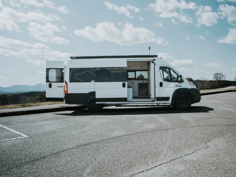 Explore the great outdoors in style with our luxuriously crafted 2021 Ram Promaster campervan, brought to you by Noke Van Adventures and built by the renowned Noke Van Co. This versatile and well-equipped camper is your ticket to a hassle-free and comfortable adventure.Key Features:1. Off-Grid Comfort: Embrace the freedom of off-grid living with a Maxxfan, Air Conditioner and a Webasto heater to keep you cool in the summer and warm in the winter. The battery bank and components ensure a reliable power supply for all your needs.2. Cozy Sleeping Quarters: Drift into a restful sleep on the queen-size bed, ensuring you wake up refreshed and ready for the day's adventures.3. Work Where You Wander: Make use of the two full-size monitors if you need to take work with you on the road.4. Efficient Kitchen Setup: The thoughtfully designed kitchen includes a fridge, sink, and induction cooktop, allowing you to prepare delicious meals on the road.5. Privacy and Light Control: Blackout window covers provide privacy when needed and help regulate the natural light inside, creating a comfortable and intimate atmosphere.6. Water Supply: With a 25-gallon water tank, you have an ample supply for cooking, cleaning, and showering, ensuring you stay refreshed during your journey.7. Solar Power: Harness the power of the sun with the solar setup, allowing you to recharge and stay off-grid for longer periods.7. Modern Design: Enjoy the sleek and modern interior design that complements the functionality of the campervan, creating a space you'll love to call home, no matter where you roam.Experience the freedom of the open road with Noke Van Adventures. Our campervan is ready to take you on unforgettable journeys, providing comfort, convenience, and the thrill of outdoor exploration. Book now on Outdoorsy and embark on your next adventure with confidence.What's included • Kitchen Essentials: