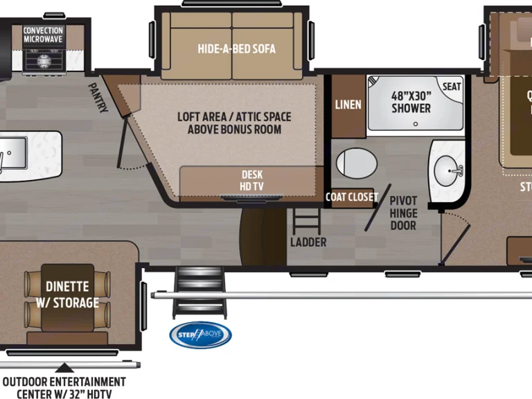 Beautiful two bedroom fifth wheel. Rear entertainment, leather sofa and leather reclining theater seats. Large Fridge/Freezer. Sleeps at least 6. Granite counter tops, microwave/convection oven, stove, oven. Dining room table/chairs. Master has king size bed. 2nd bedroom has full size bed. Sofa converts to full size bed. there is a full size loft above the 2nd bedroom for kids. 3 tvs.