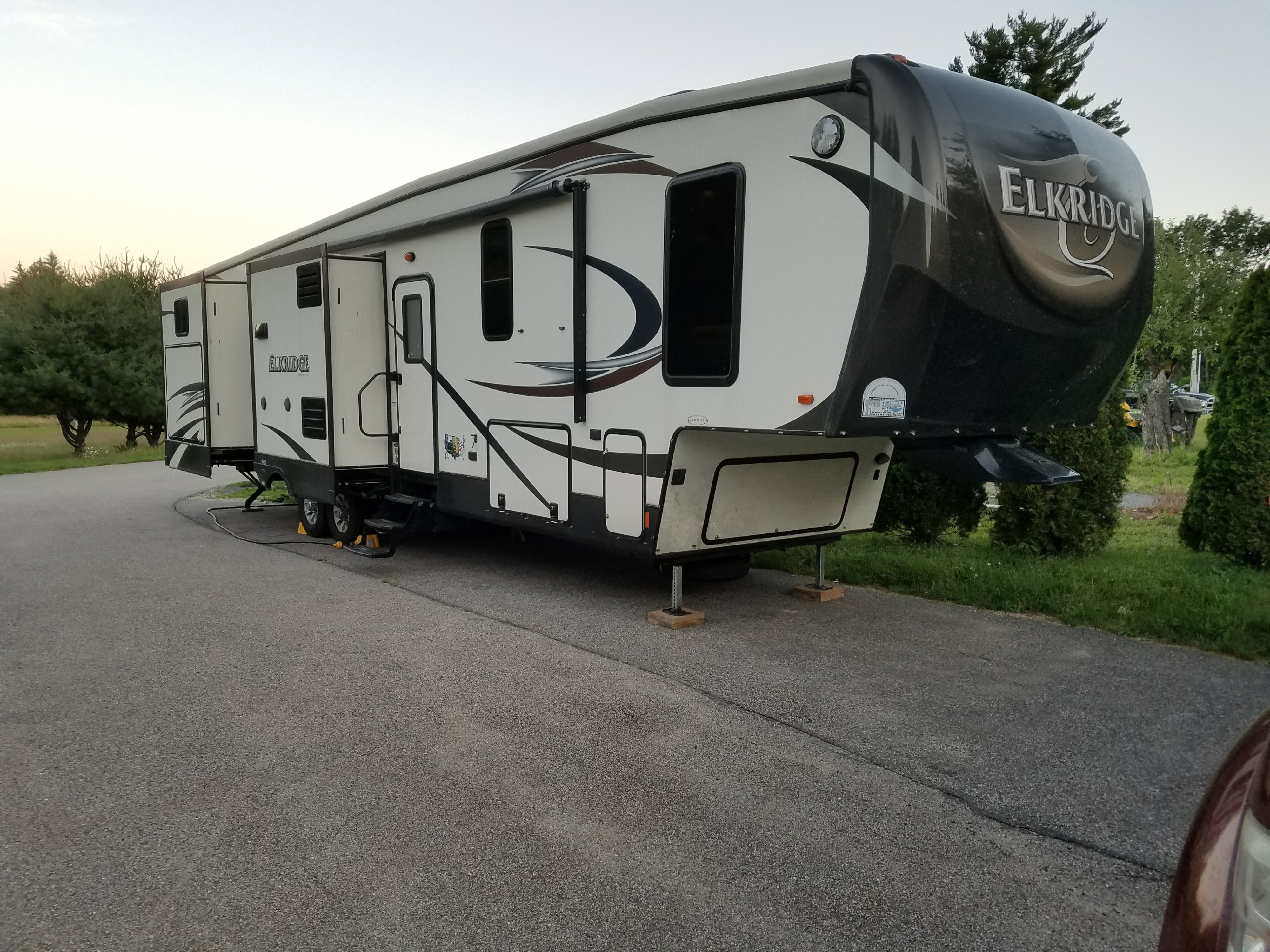-Two entrances including one into main living/kitchen area and one into rear bathroomThe camper has many upgrades including five 12 ply tires in good as new condition, custom made skirting, washer/dryer combo, DishTV satellite dish mounted on the roof with receiver and cable wiring, and I will throw in water hoses, blocks, leveling devices, and other accessories that you will not have to purchase. We also replaced all of the blinds with blackout shades, repainted in the living room area, replaced the dining room table seats with storage bench seating, and replaced the couch with a residential leather reclining love seat!
