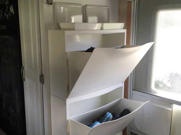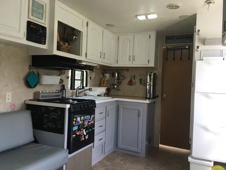 Toy hauler that is remodeled on the inside. Two vinyl jack knife couches that fold flat against the walls so you can tie down 4 wheelers or throw some kayaks in. Queen bed on lift so it can be near the ceiling while hauling toys and down at regular bed height at night time. Can sleep 2 adults and 4 kids comfortably. The main area has a ton of cabinets/storage. The kitchen has lots of counter space and nice size fridge and stove/oven & microwave. The bathroom is spacious with a very large counter/storage and a shower/tub combo. There is also a very large closet in the bathroom.