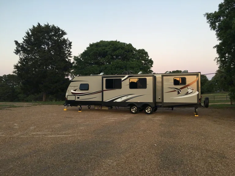 A home on wheels. This trailer features 2 bedrooms and 2 bathrooms. It’s perfect for a family getaway and gives everyone the space they need.This is a large bumper-pull travel trailer with 2 slide-outs and has 3 main areas: master bedroom, living area, and "kids" room. The trailer will sleep 9 people comfortably.The master bedroom has a full size queen, plenty of storage, and attached full bathroom.The kids/second bedroom area has its own privacy drape and can be closed off to the rest of the living area. There is a half bathroom near the kids room.The main area has a couch, that turns into a full bed, u-shaped dining area, full kitchen with a 3 burner stove, oven, microwave, double sink, pantry, and coffee station. This area has a 32" LED television with entertainment center and Bluetooth audio.The outside of the trailer includes an outdoor kitchen with refrigerator, 2 burner stove, sink, outdoor shower, awning with LED lighting and speakers.We include: plastic cups, flatware, plates, kitchen utensils, foil, pots and pans, cutting board, coffee maker, outdoor rug, 2 reclining folding chairs, and various other supplies.Things we recommend you bring: