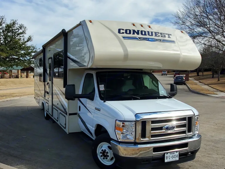 This luxury RV is perfect for a family or several couples and is loaded with amenities! A queen bed in the rear, bunk beds and a double bed over the cab make the most of the space and two slide outs provide room to roam inside. A great vehicle to see the country or state parks in Texas.