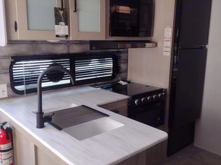 The 2023 Forest River Salem Cruise Lite 28Vbxl is a 33-foot travel trailer designed for family adventures, comfortably sleeping up to 10. It features a rear private bunkhouse with two Versa-bunks and a Versa-queen bed, a front custom king bed with Versa Tilt, and a U-shaped dinette that converts into additional sleeping space. The central kitchen offers a full-size refrigerator, three-burner stove, oven, and microwave. Enjoy the cozy fireplace in the living area and the convenience of an exterior camp kitchen. Additional amenities include a 16-foot power awning, walk-in shower, and ample storage.