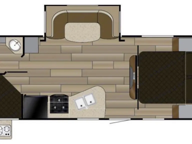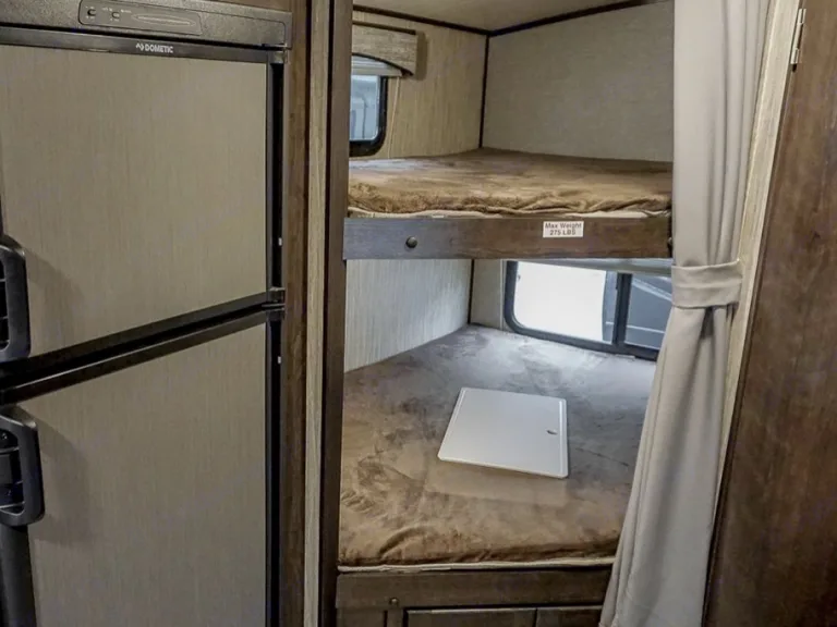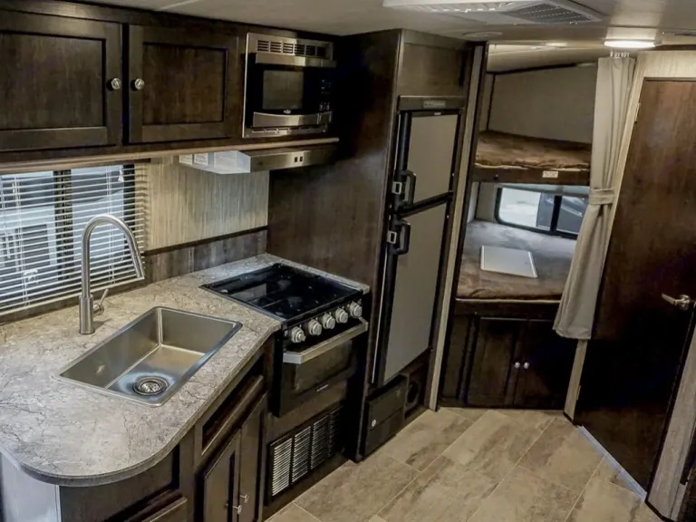 Queen size master bedroom with lots of closet storage and double bunk beds with a u-shaped dinette slide out that turns into a bed. USB charging stations in each bedding area.Kitchen: