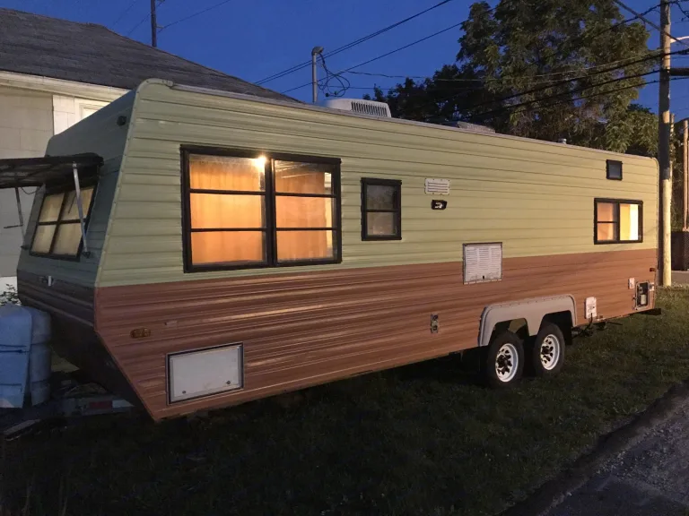 Completely renovated; Rustic reclaimed wood features; Copper Tin ceiling in bathroom and shower; Ice cold A/C; retro exterior paint; vinyl resilient wood plank flooring throughout; plenty of storage; large living area for entertaining; fold out dining table; living area bench folds out to full size bed; Queen size bedroom w/ 2 upper bunks. Full canopy.